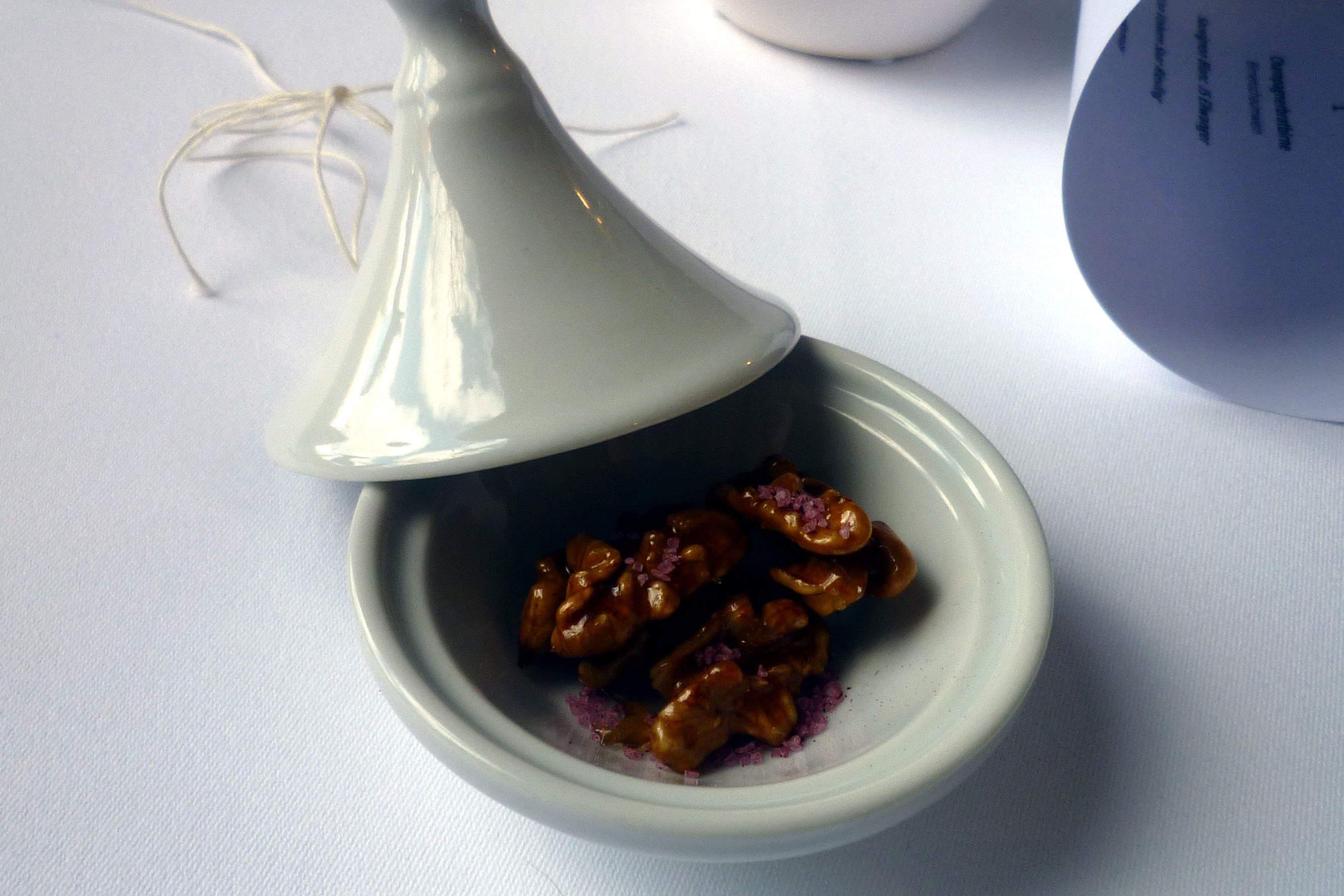 Vorab gibt es kleine Knabbereien wie karamellisierte Walnüsse mit Blütensalz, Blätterteigstange mit Olivenöl und Schwarz Kümmel und Baguette mit verschiedenen Olivenölen.