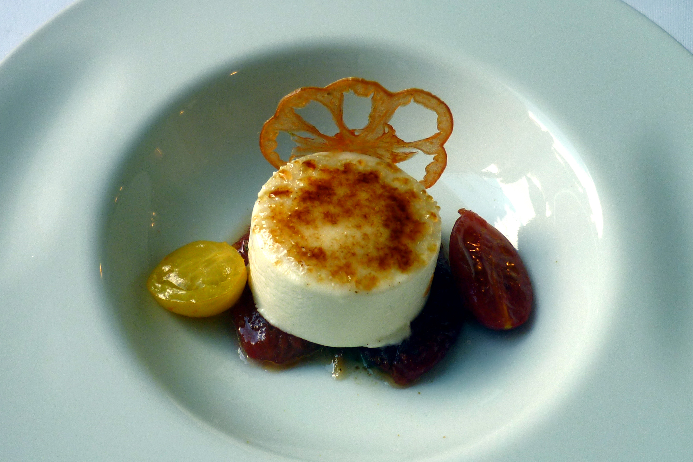 Die Oberfläche des Ziegenkäses leicht karamellisieren. Dazu Tomaten in den verschiedensten Zubereitungsarten und mit Thymian gewürzt