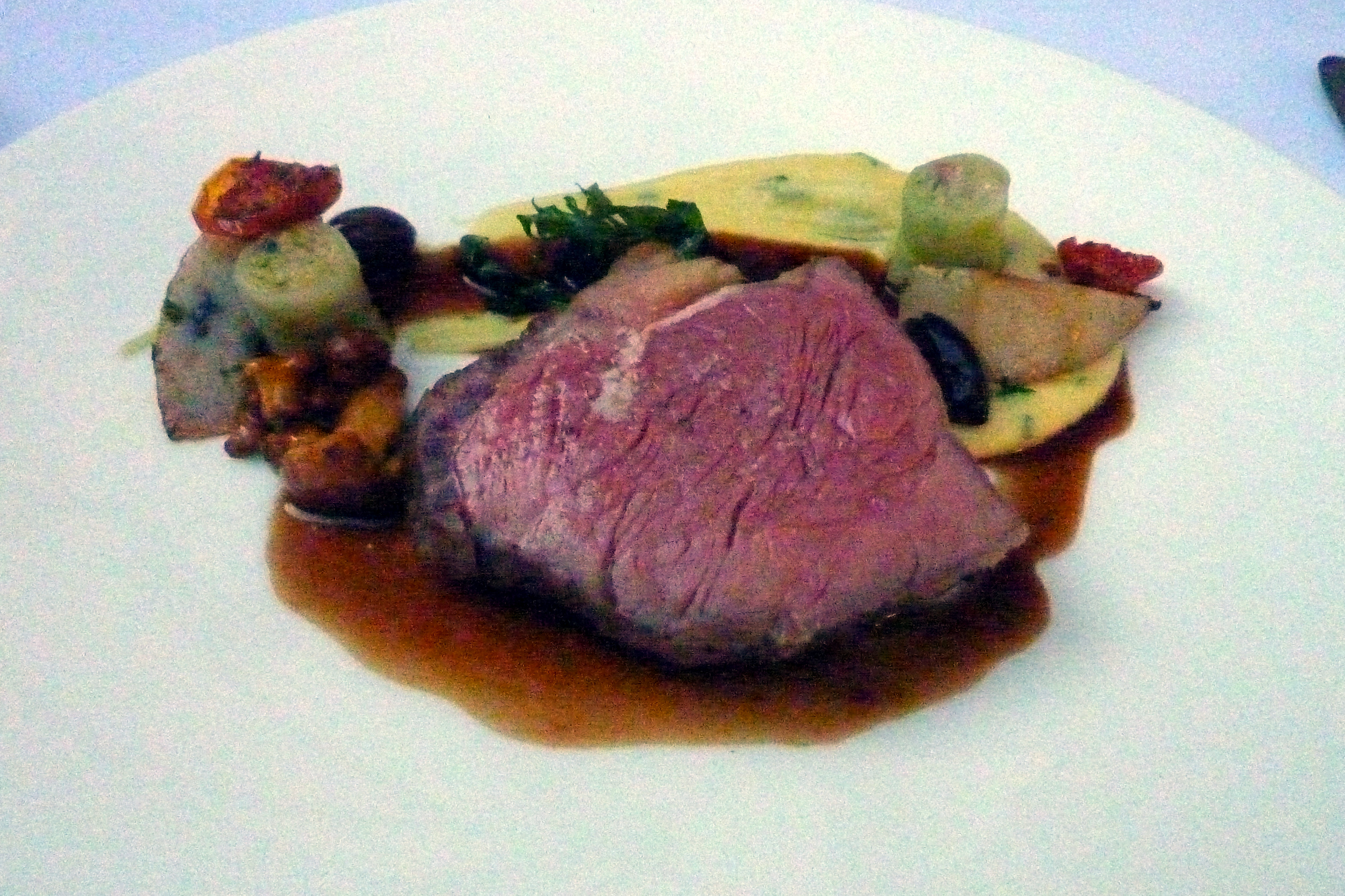 4. Gang: Trockengereifter Rücken vom Schwarzwälder Färsenrind, Jus von geschmorter Ochsenbacke, Kartoffelstock, Spitzkraut, getrocknete Tomaten