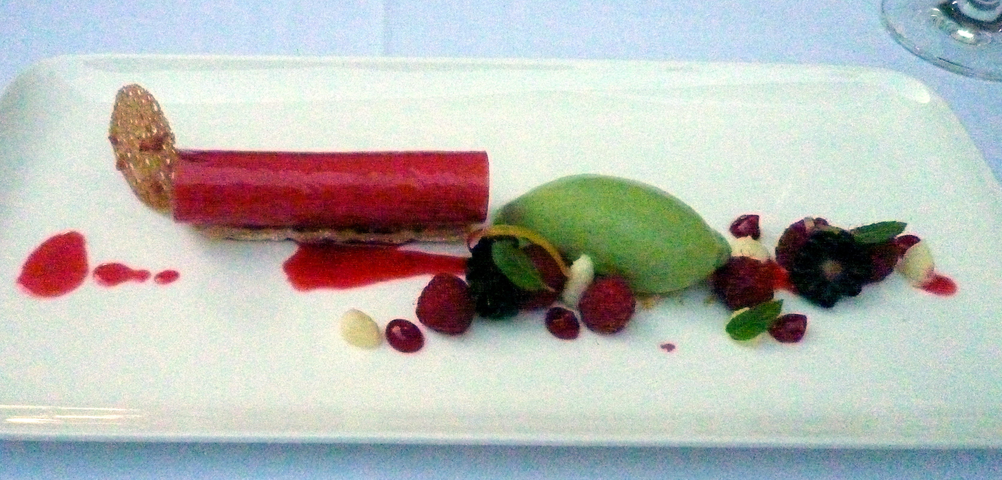 6. Gang: Cannelloni von Himbeeren aus Omas Garten, Sauerampfer Eis, konfierte Zitronenschale.