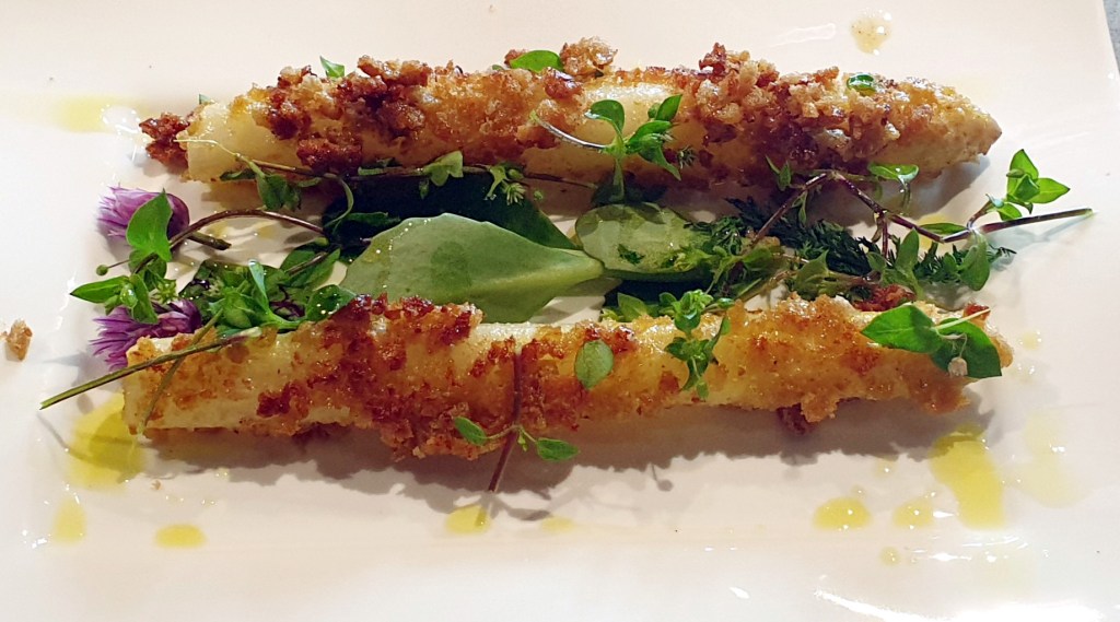 gebratenen Spargel, Wildkräuter aus dem eigenen Garten.
