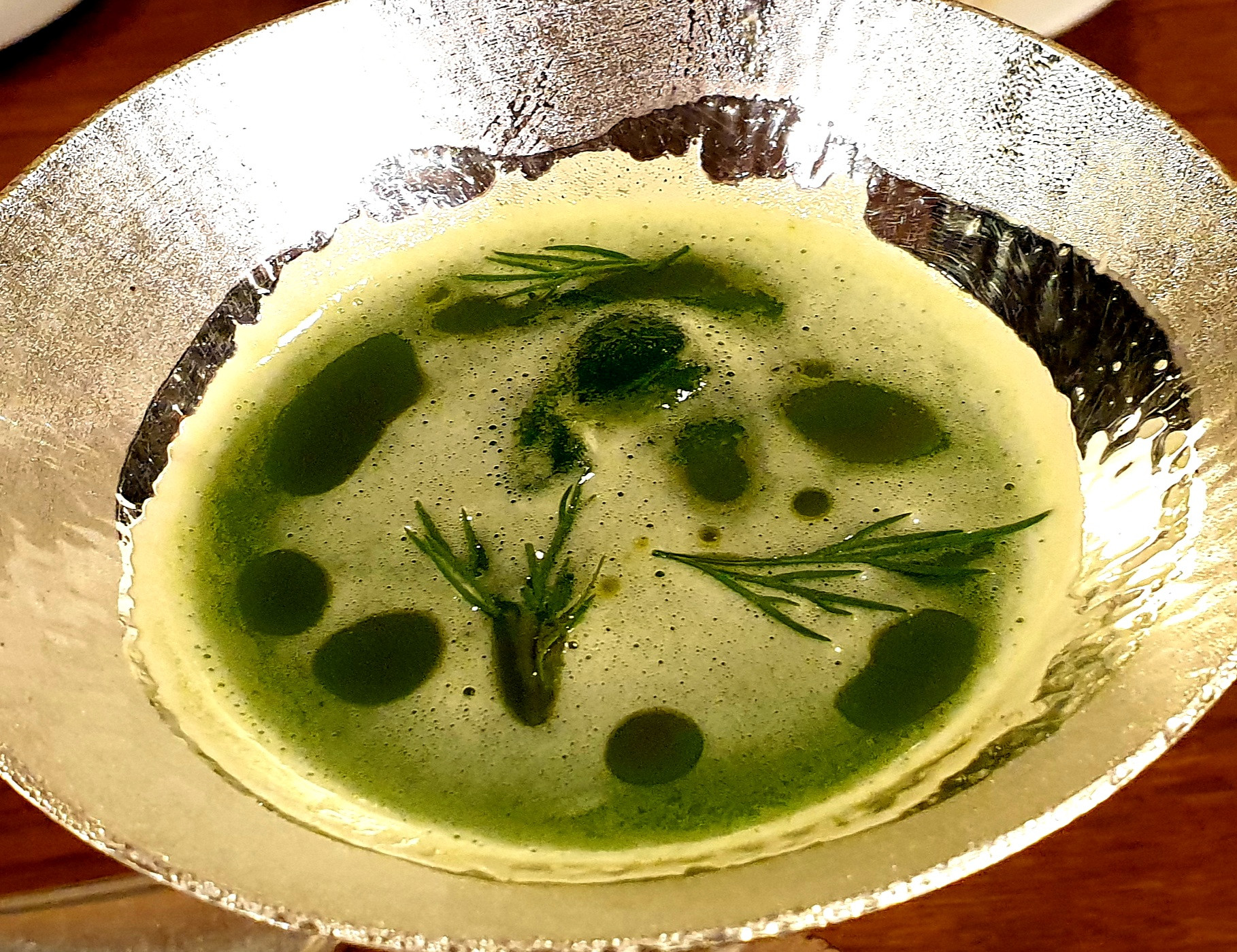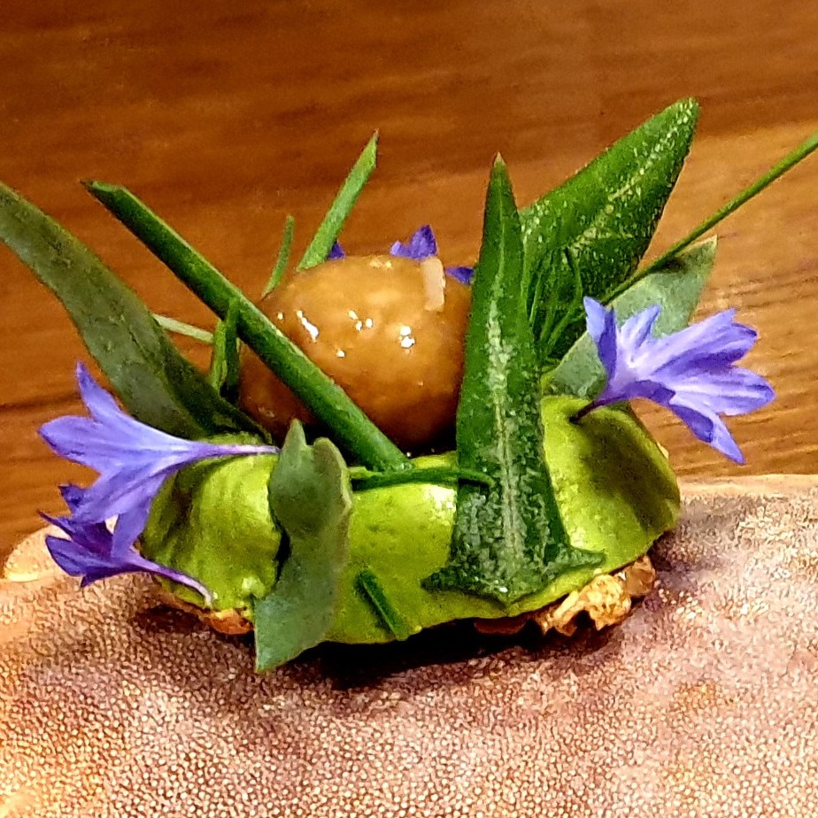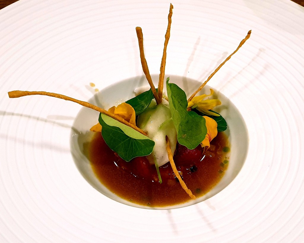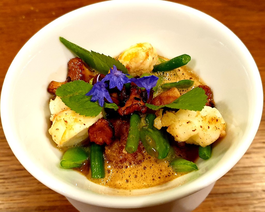 Hervorzuheben ist hier der Gang mit Forellenrogen ~Rauchbouillon ~Schnittlauch. Durch den angegossenen Rauchbouillon entwickelte sich ein Umami Geschmack sondergleichen. Ich vergebe ungern Punkte, aber hier wurde ich 10 von 10 geben.