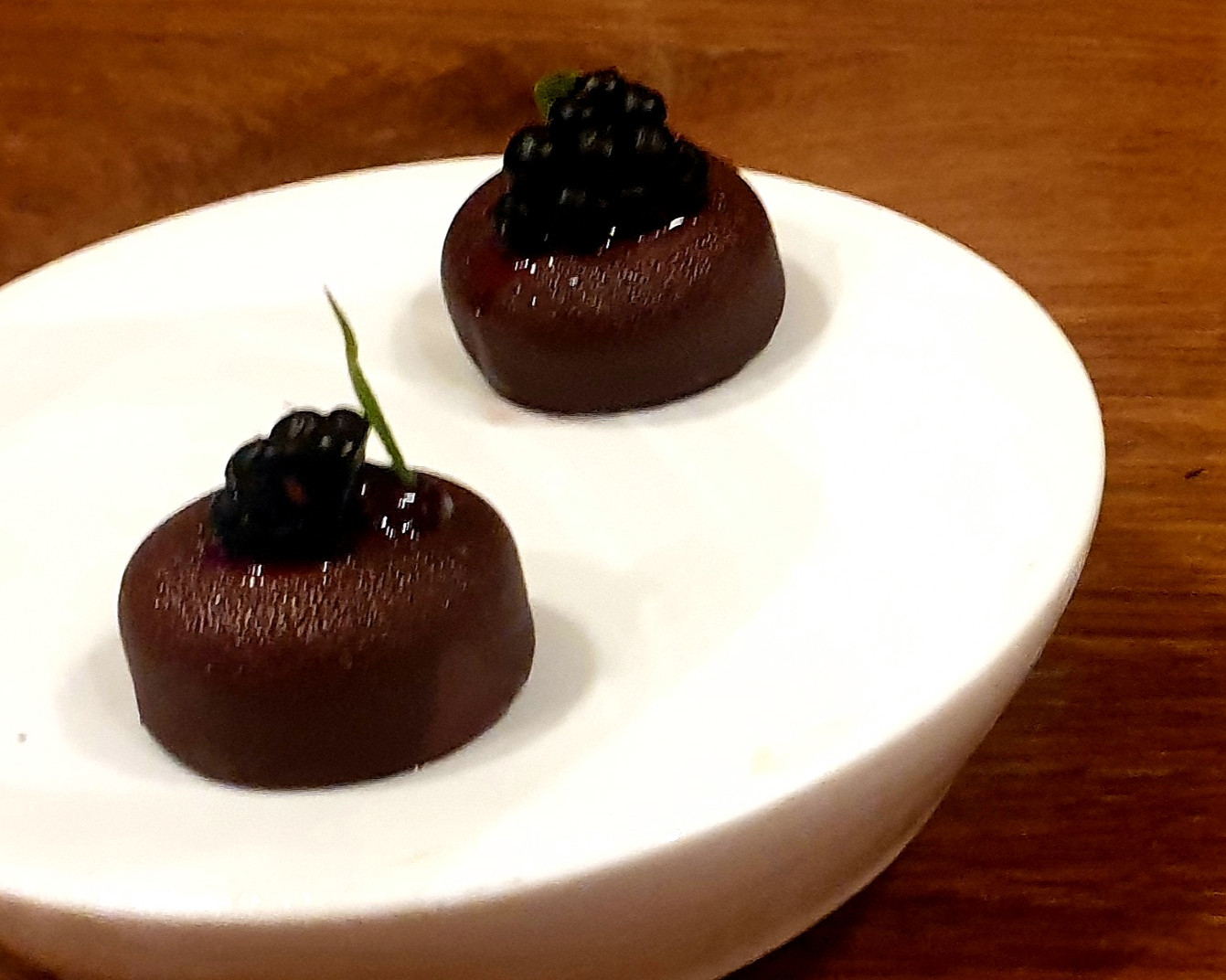 Nachdem wir die COVID 19 Prozedur hinter uns gebracht hatten, im Übrigen „streng“ überwacht von Hausherr Johannes King, wurden wir von Gerritt Fischer, Demi Chef de Rang, empfangen und in den Port-Romm geleitet. Herr Fischer war den gesamten Abend für uns zuständig und man muss ihm ein großes Lob aussprechen. Immer anwesend, wenn man ihn brauchte, ansonsten sehr diskret im Hintergrund.  Auch Jan-Phillip Berner begrüßte uns und wir entschieden und für ein 6 Gang Menü. Davor gab es noch 5 kleine „Häppchen“ und im Anschluss des Menüs noch 5 kleine Süßigkeiten.