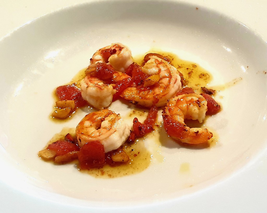 Die Garnelen werden geschält, dabei auch den Darm entfernen. In einer Pfanne Olivenöl heiß werden lassen. Die Garnelen hineinlegen, salzen und pfeffern. Nach ca. 1 Minute umdrehen. Den in Scheiben geschnittenen Knoblauch und den Ingwer dazugeben. Nach ca. 3 Minuten sind die Garnelen fertig, sie sollen noch leicht glasig sein. Die Garnelen warm stellen. Die Tomatenstücke in die Pfanne geben, kurz andünsten lassen und Pastis, Noilly Prat und Weißwein dazu gießen. Nochmals abschmecken, die Garnelen dazugeben und sehr kurz aufkochen lassen. In vorgewärmte tiefe Teller geben und sofort servieren.