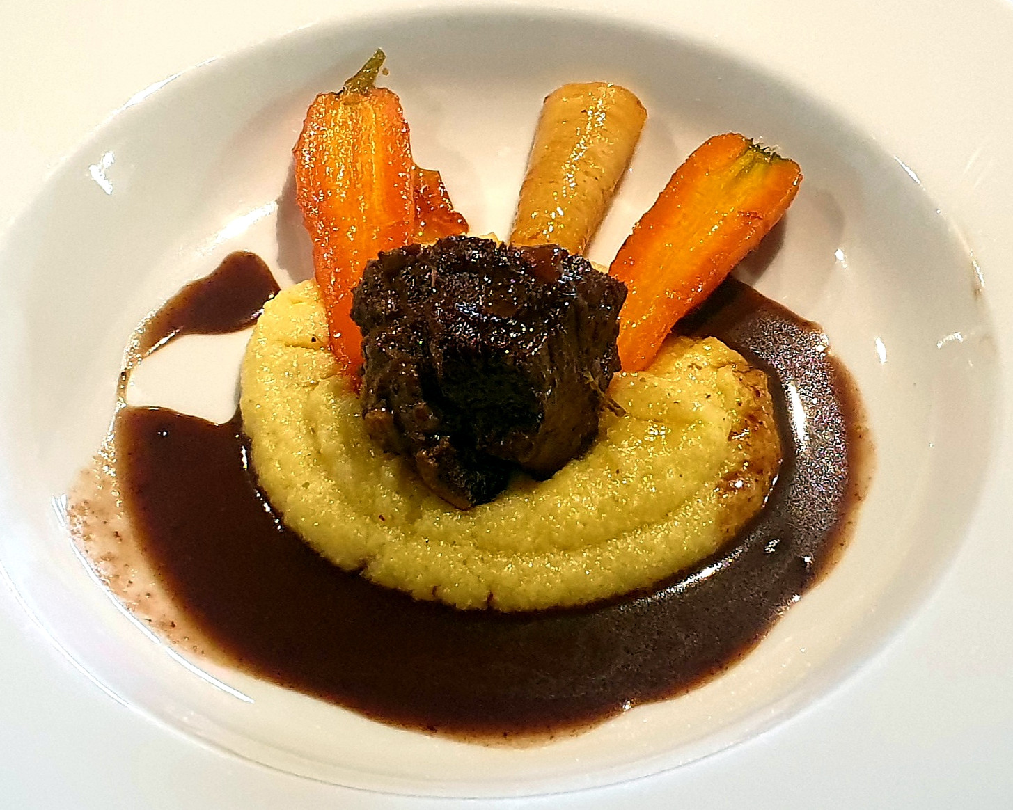 Dazu gibt es karamellisierte Karotten und Polenta.