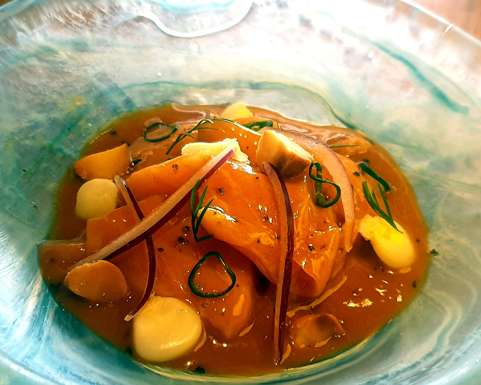 Danach zweimal Ceviche. Einmal mit Fisch des Tages mit Süßkartoffel und gebratenen Mais, sowie Ceviche vom Lachs. Sowie zweimal Cannelloni mit Meeresfrüchten.