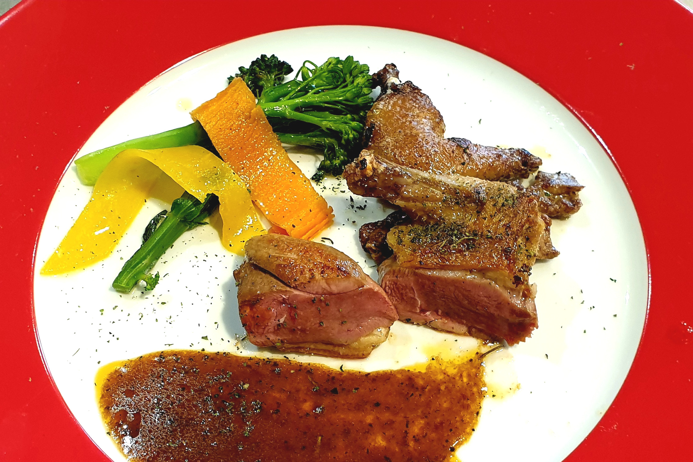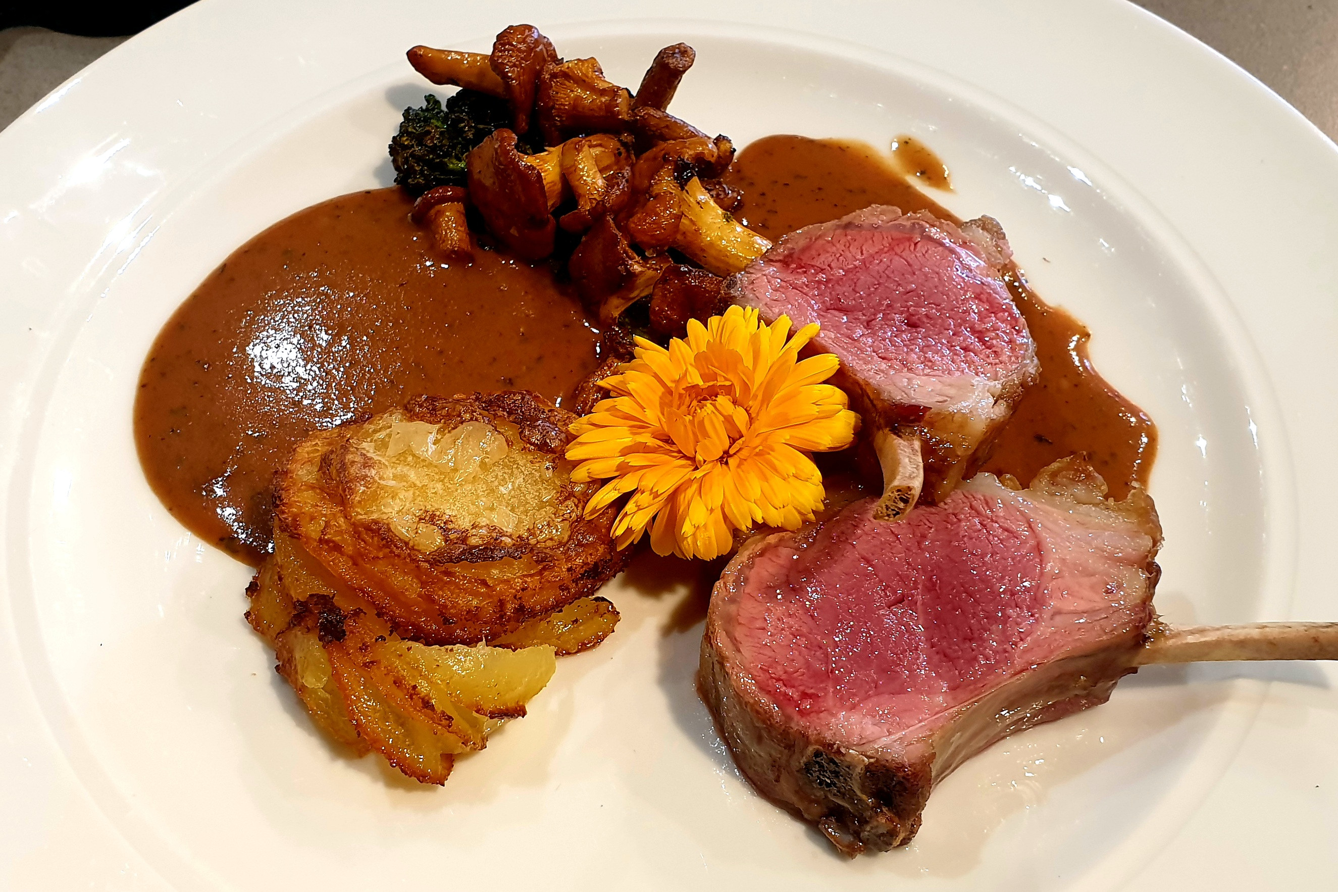Garnelen gebraten und anschließend mit Noilly Prat und Pastis abgelöschtDreimal Lachs. Lachstatar mit Basilikum und Walnussöl, Lachscarpaccio mit Kräutern und Orangen-Olivenöl. Lachsscheibe 40° gegart, mit Olivenöl-Wildkräuter. Dazu Weißwein aus Baden. Taube, (Brust, Keule, Innereien) Wildbrokkoli, Karottenstreifen, TaubenjusLammkarree medium-rare, Pfifferlinge, Kartoffelgratin, LammsauceRotwein aus Italien Jahrgang 2017Hausgemachter Johannisbeerkuchen.