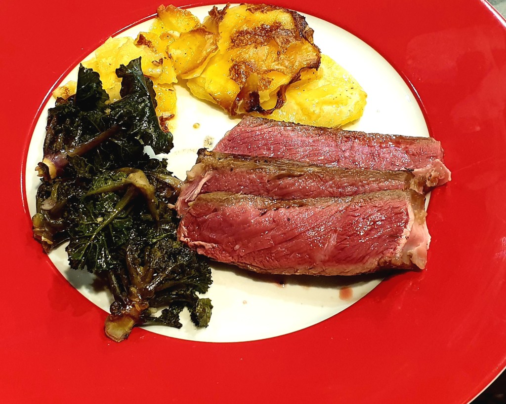 Scheiben vom Ochsenkottelet mit Kartoffelgratin und Kohlröschen (Flower Sprouts)
