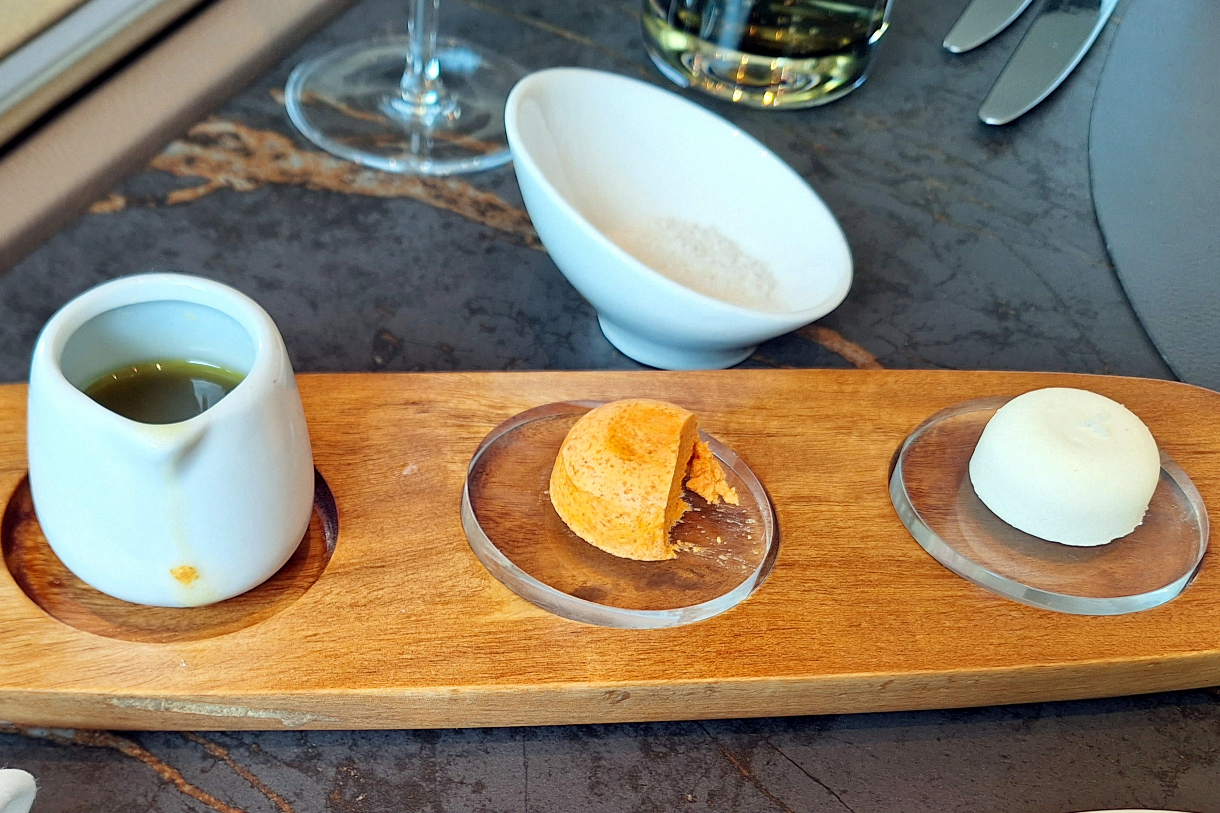 Tranche vom wilden Steinbutt mit Pistazienpraline, grünem Apfel und Blüten-Heu-Aufguss