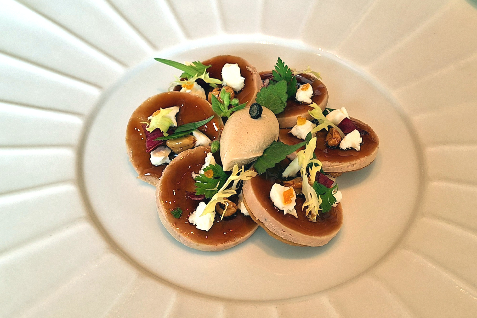 Rosace von der Gänseleber mit Schafskäse, karamelisierten Bucheckern und Pfeffereis