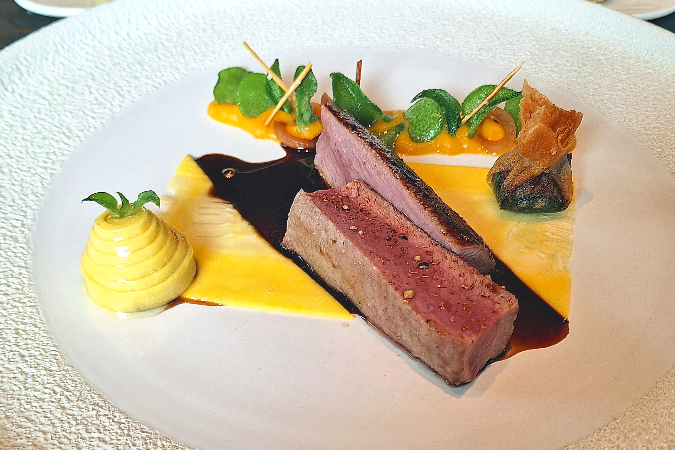Eifler Rehrücken mit Innereiencroustillant auf gebeiztem Kürbis mit Eisenkrautsalat und Rooibosjus