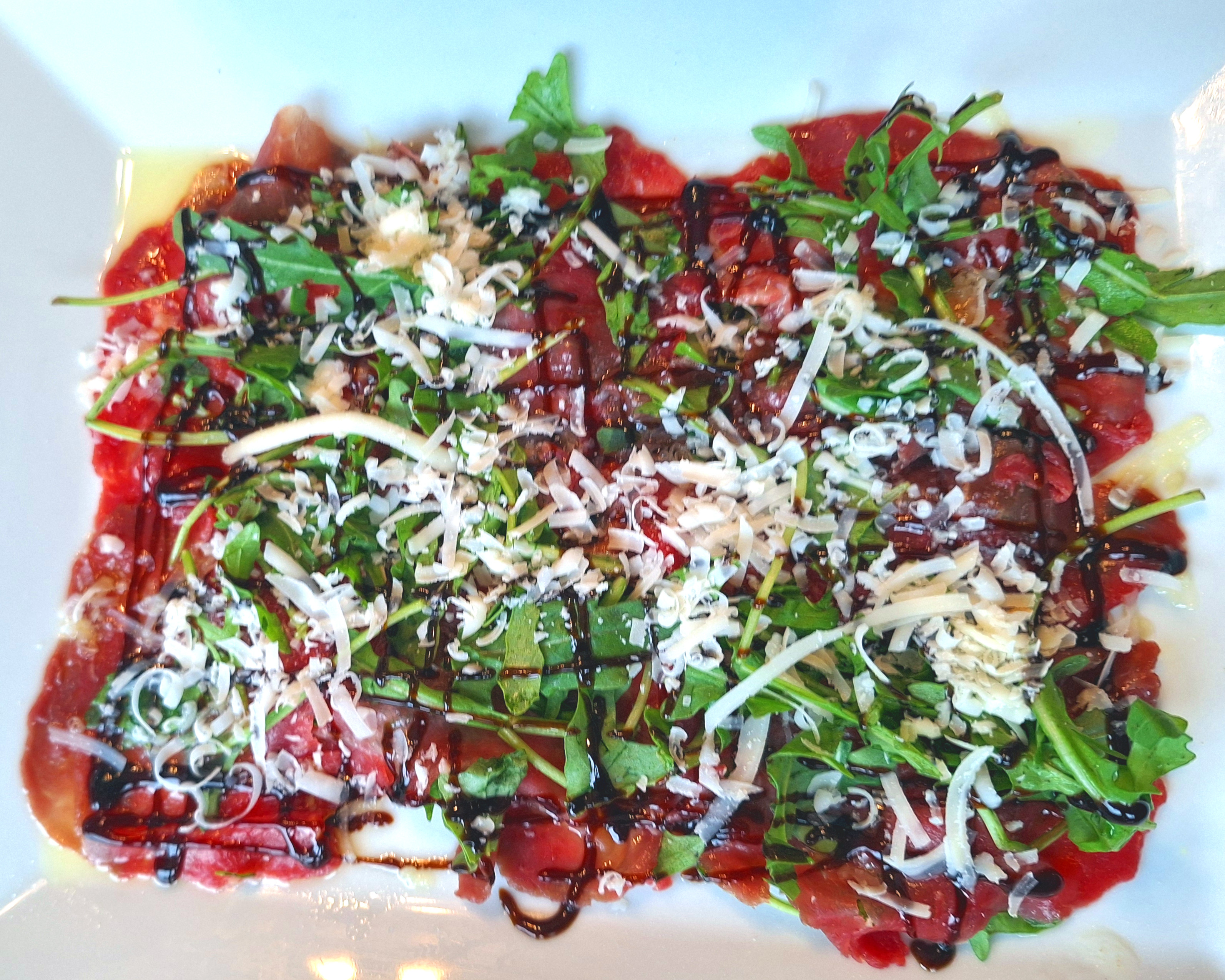 zartes Carpaccio mit würziger Sauce, Rucola und Parmesan,