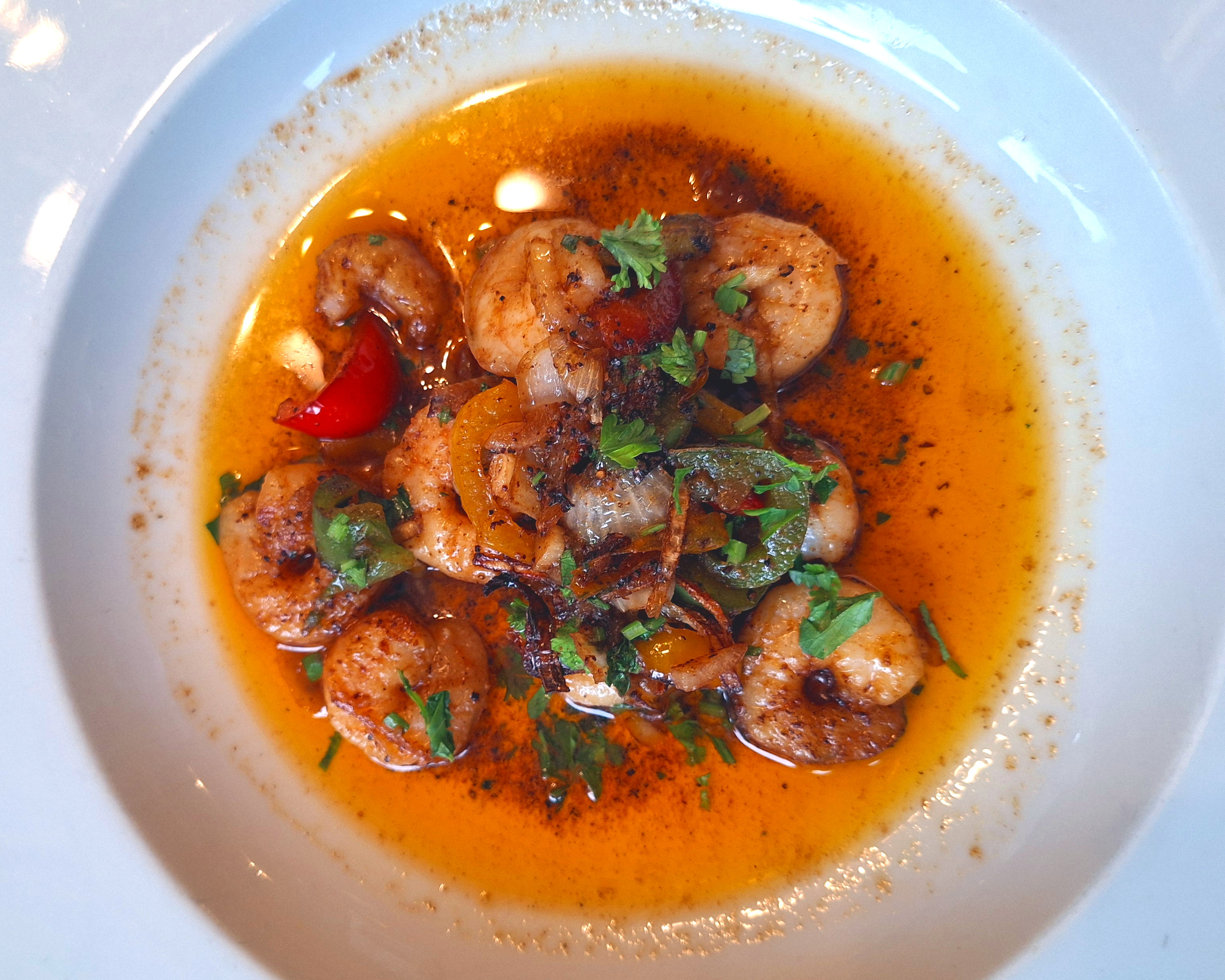 Gambas mit Paprika und Zwiebeln in Knoblauchsauce.