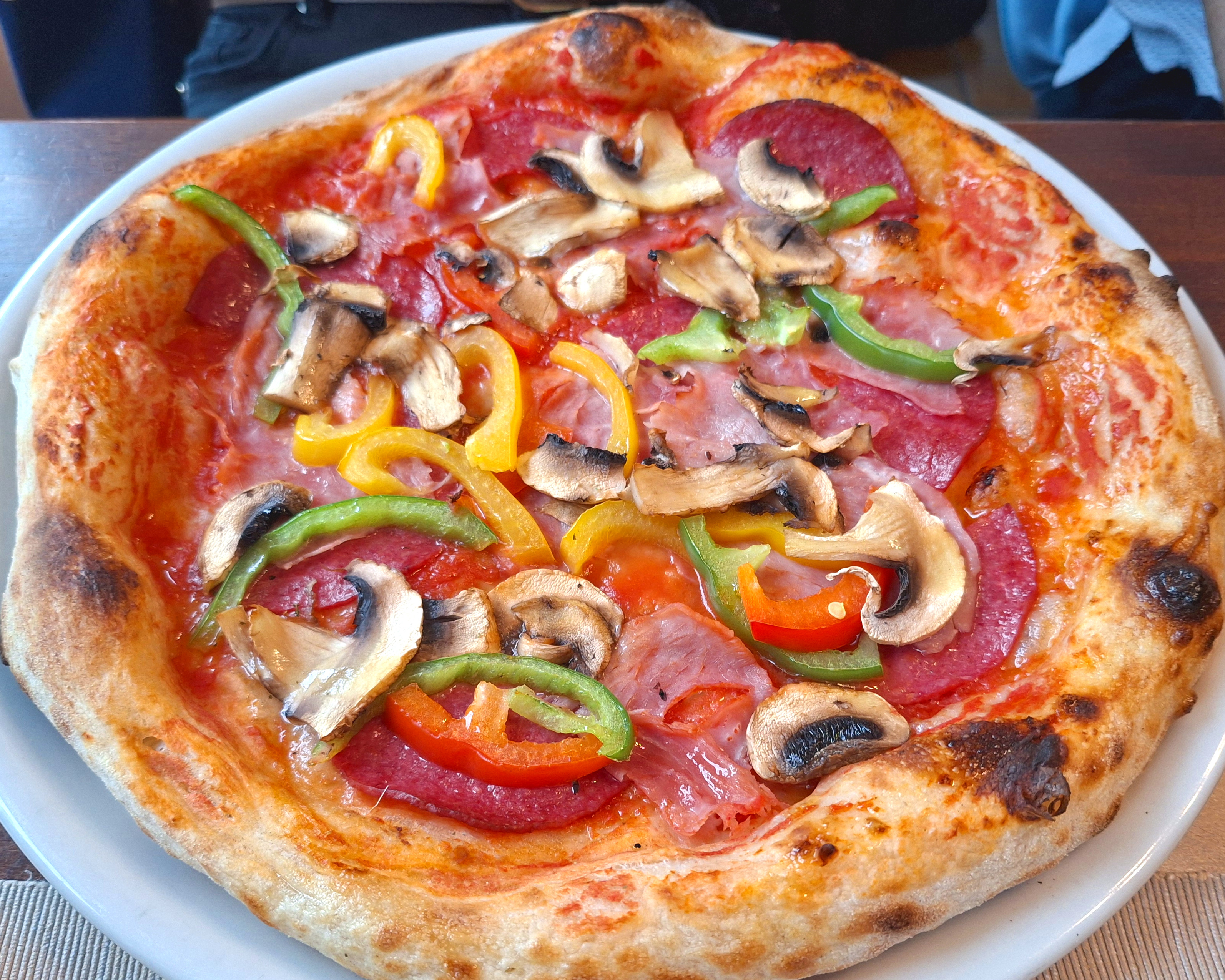 Pizza Rustica mit Tomaten, Käse, Schinken, Pilzen, Paprika und Salami,