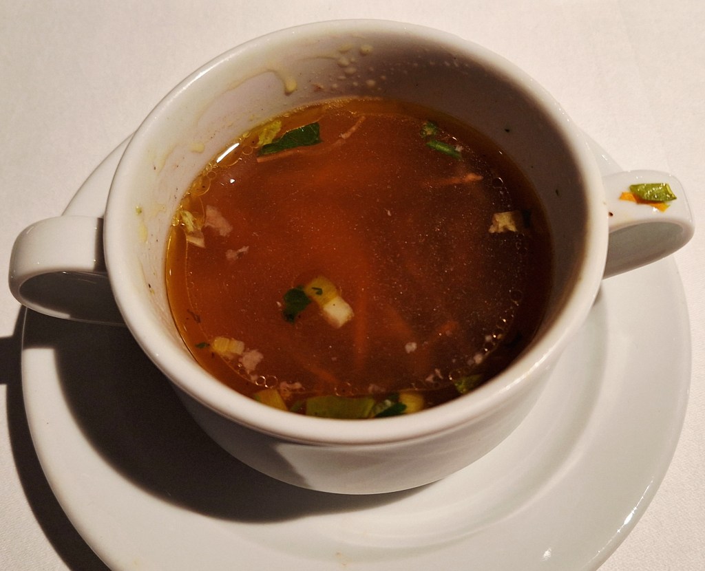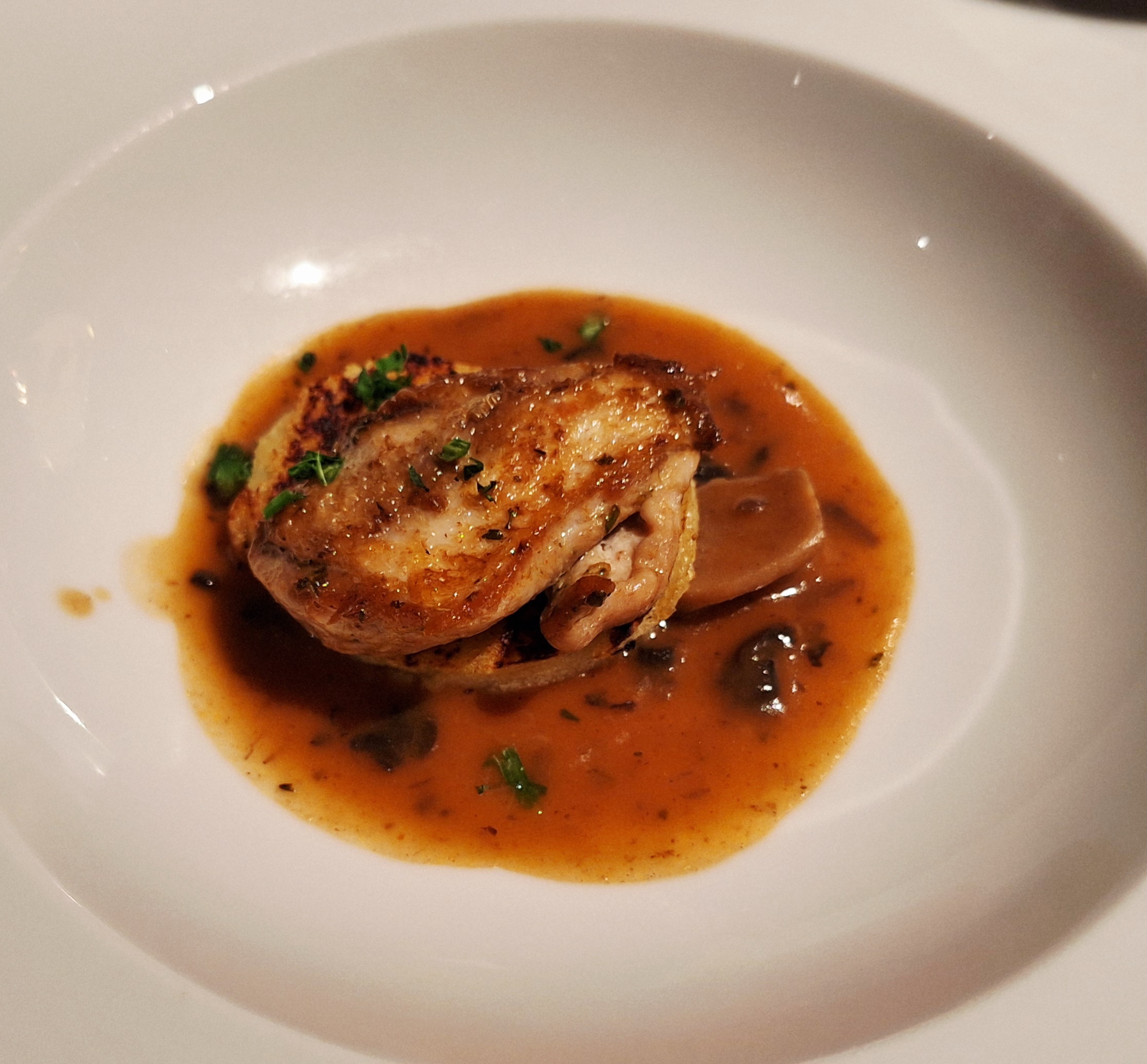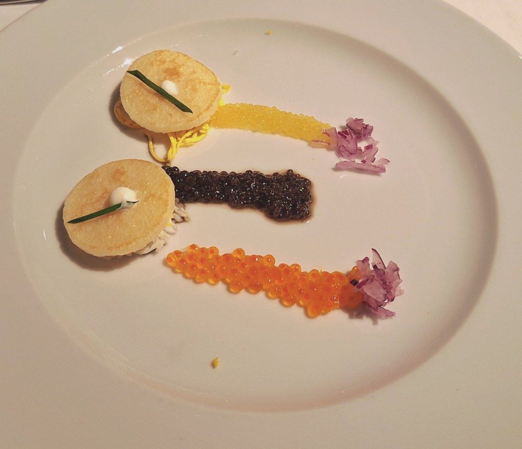 Abends wechselte das Menü täglich. Zur Auswahl standen ein Fünf-Gänge-Menü mit Fleisch und/oder Fisch sowie ein veganes Pendant. Alternativ konnte man sich sein eigenes Menü zusammenstellen.