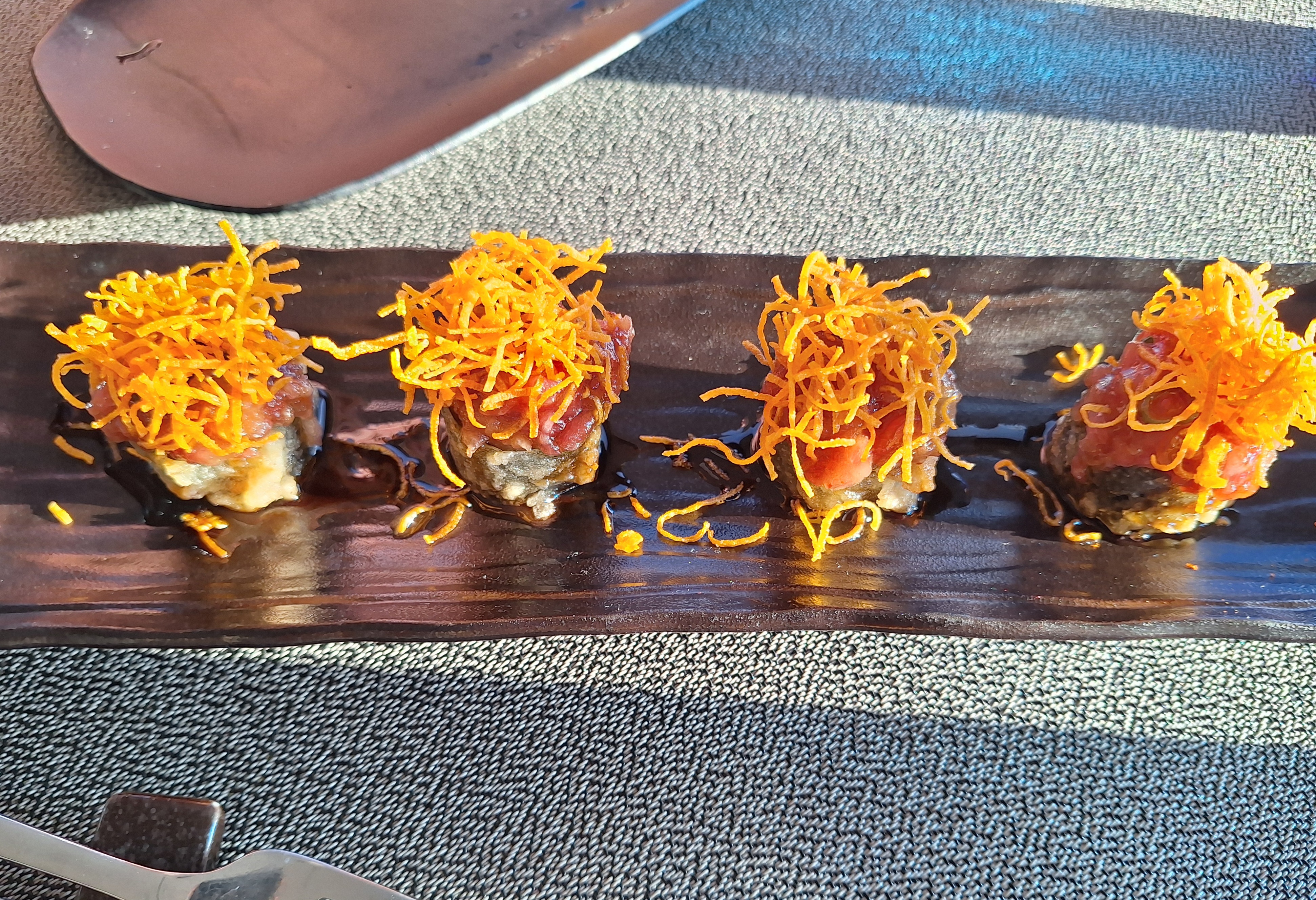 Der Sonntagabend hielt ein besonderes Highlight bereit: das Kabuki an der Promenade von Maspalomas. Zugegeben – ein japanisches Restaurant direkt am Strand von Gran Canaria klingt ungewöhnlich. Doch genau diese Kombination macht den Reiz aus. Das Kabuki liegt im stilvollen Hotel Lopesan Costa Meloneras und gehört zur renommierten Kabuki-Gruppe, bekannt für ihre kreative Fusion aus japanischer und mediterraner Küche. Schon beim Ankommen spürt man: Hier geht es nicht nur ums Essen, sondern um ein Erlebnis. Nachdem wir bei früheren Besuchen à la carte gegessen hatten, entschieden wir uns diesmal für das Menü – und überließen die Auswahl dem Chefkoch. Eine Entscheidung, die sich als Volltreffer erwies. Der Abend begann entspannt mit einem Sake als Aperitif, begleitet von einem perfekt passenden Wein von den Kanarischen Inseln. Dann nahm das Menü Fahrt auf: kunstvoll angerichtetes Sushi und Sashimi, gefolgt von zartem Thunfisch-Tatar. Besonders in Erinnerung blieben das knusprige Steinbutt-Tempura und die aromatischen Gyoza mit Entenfüllung. Ein echtes Highlight waren die hauchdünnen Scheiben vom Wagyu – butterzart und voller Geschmack. Jeder Gang überraschte, jede Kombination war durchdacht und harmonisch. Ein Abend, der nicht nur kulinarisch, sondern auch atmosphärisch in Erinnerung bleibt.
