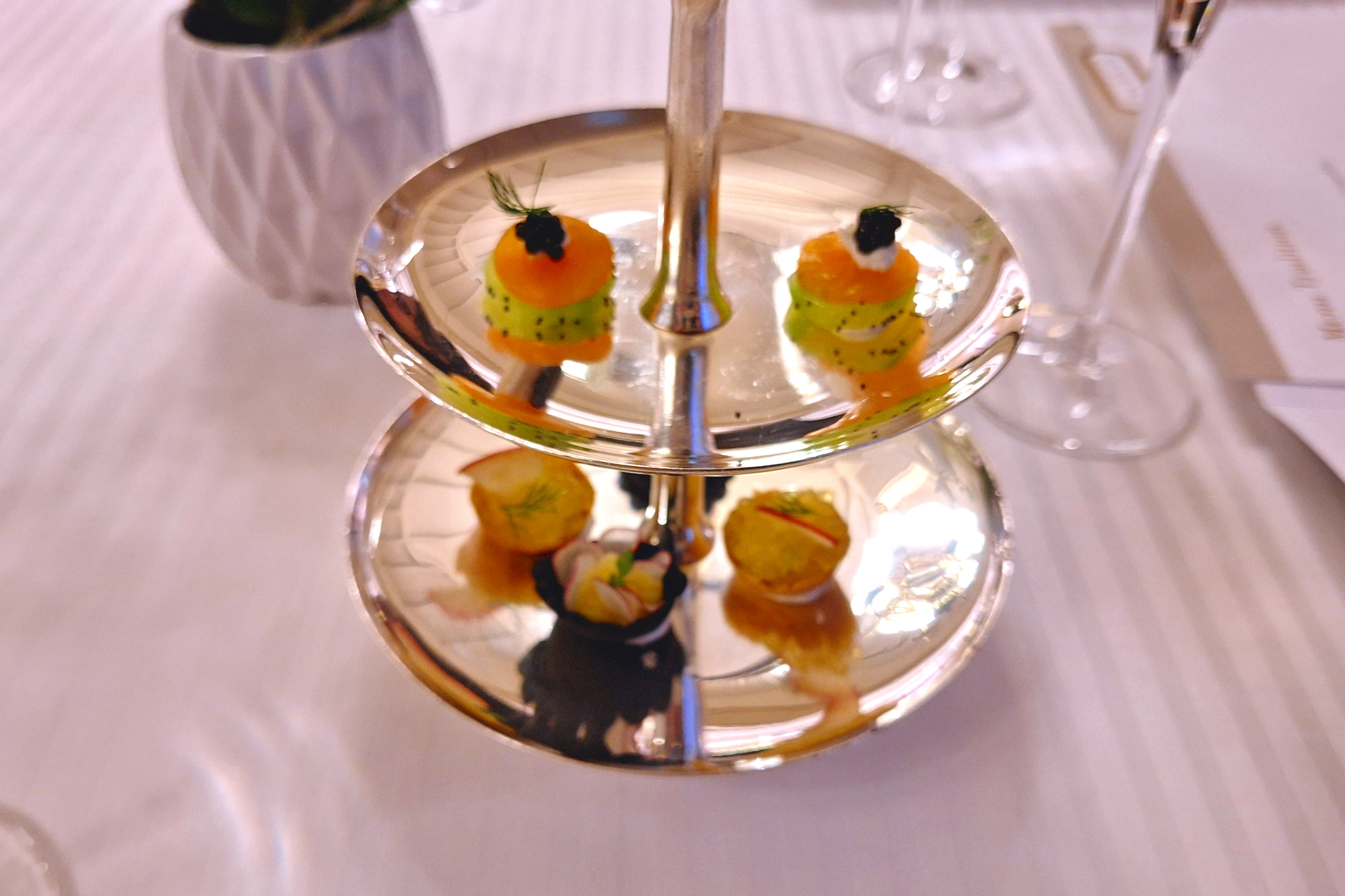 Zum Auftakt erhielten wir alle ein Glas Champagner, dazu stellte man einige Amuse-Bouches auf den Tisch, die jedoch kaum der Rede wert waren. Dann kam die Weinkarte – ein Wälzer, in dem sich kaum jemand zurechtfindet.