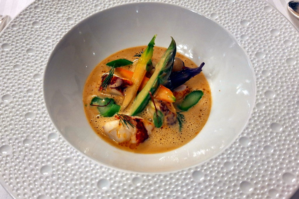Das Gericht vereint den feinen Geschmack des Blauen Hummers mit frischem Saisongemüse wie grünem Spargel und jungen Karotten. Die leichte, aromatische Zubereitung betont die Natürlichkeit der Zutaten. Diese Frische und Harmonie überzeugen, auch wenn ein Vergleich mit einem ähnlichen Gericht gestern Abend von Keller in Oberbergen zeigt, dass dort Würze und Textur noch etwas besser gelingen. Dennoch bleibt das Frühlingsfrikassee am Paul Bocuse ein gelungenes Geschmackserlebnis.