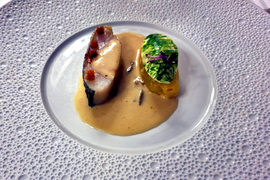 Der Gelbflossen-Seehecht beeindruckt mit zarter Textur und feinem Aroma, wurde jedoch etwas trocken serviert. Die cremige Muschelsoße mit mildem Meeresgeschmack harmoniert hervorragend mit dem Fisch und gleicht den Mangel aus. Die Beilage irritiert jedoch: Statt der klassischen Vichyssoise, einer kalten Kartoffel-Sahnesuppe, kam eine einfache Salzkartoffel auf den Teller – vermutlich ein Fehler in der Menübeschreibung. Diese Diskrepanz trübte den ansonsten stimmigen Eindruck.