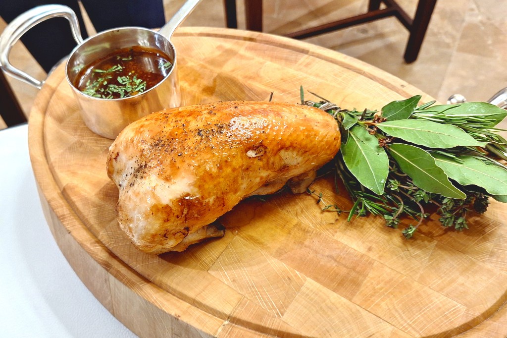 Die Volaille de Bresse, eine der edelsten Geflügelspezialitäten Frankreichs, überzeugt hier mit butterzartem Fleisch und intensivem Geschmack. Das Tranchieren der Brust am Tisch setzt das Produkt gekonnt in Szene. Die Sauce mit Estragonessig bringt eine frische, leicht herbe Note, die perfekt mit dem würzigen Geflügel harmoniert. Die gut gewürzten Keulen und die klassischen pommes lyonnaises ergänzen das Gericht ideal. Diese Kombination aus Tradition, Raffinesse und handwerklicher Präzision macht es zu einem Höhepunkt für Liebhaber der französischen Küche.