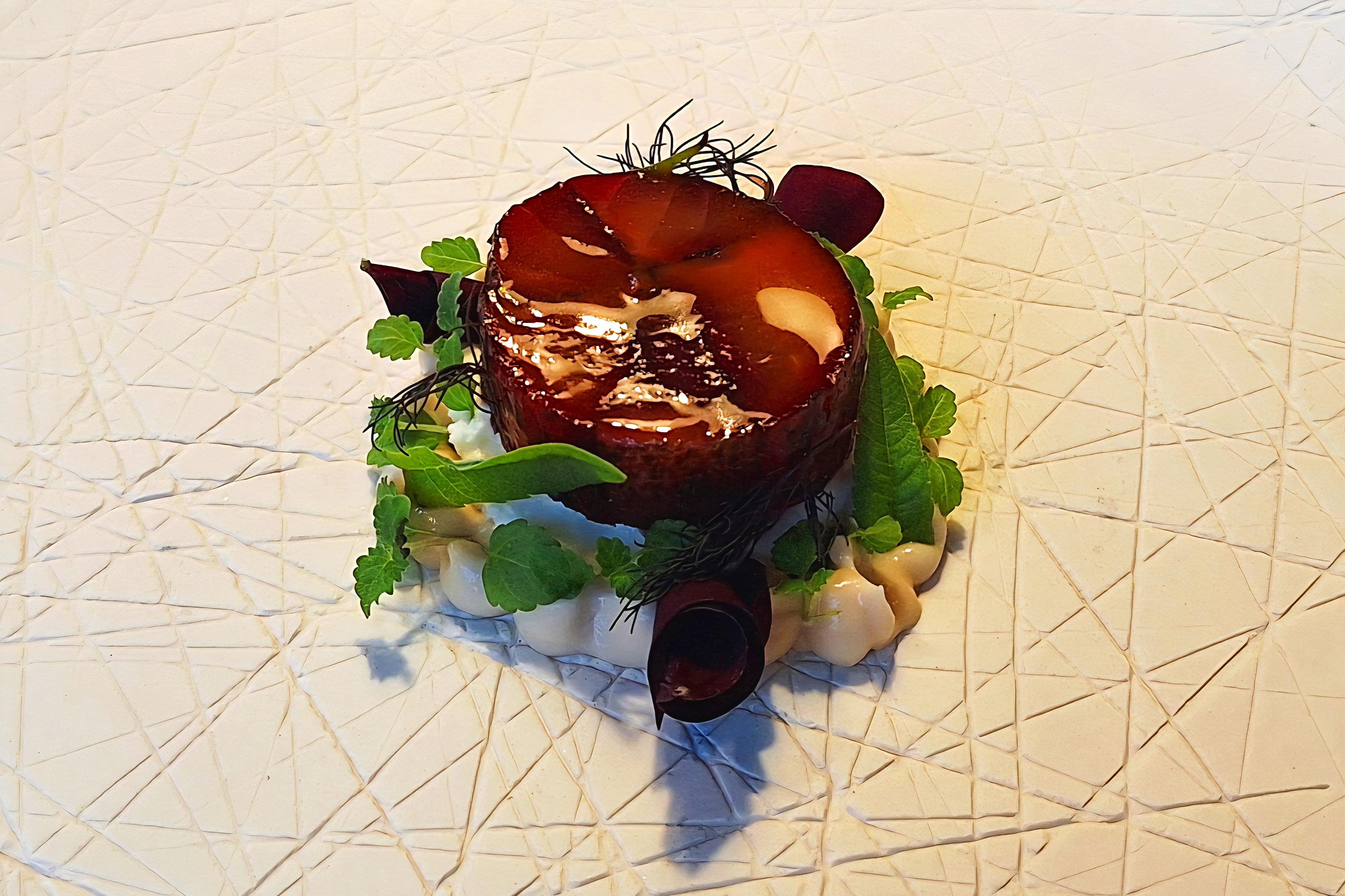 Leber mit Zwetschgen, Steinbuttravioli und Garnele, danach Lammhaxe bzw. Seezunge. Zum Abschluss dann ein Apfelküchlein.