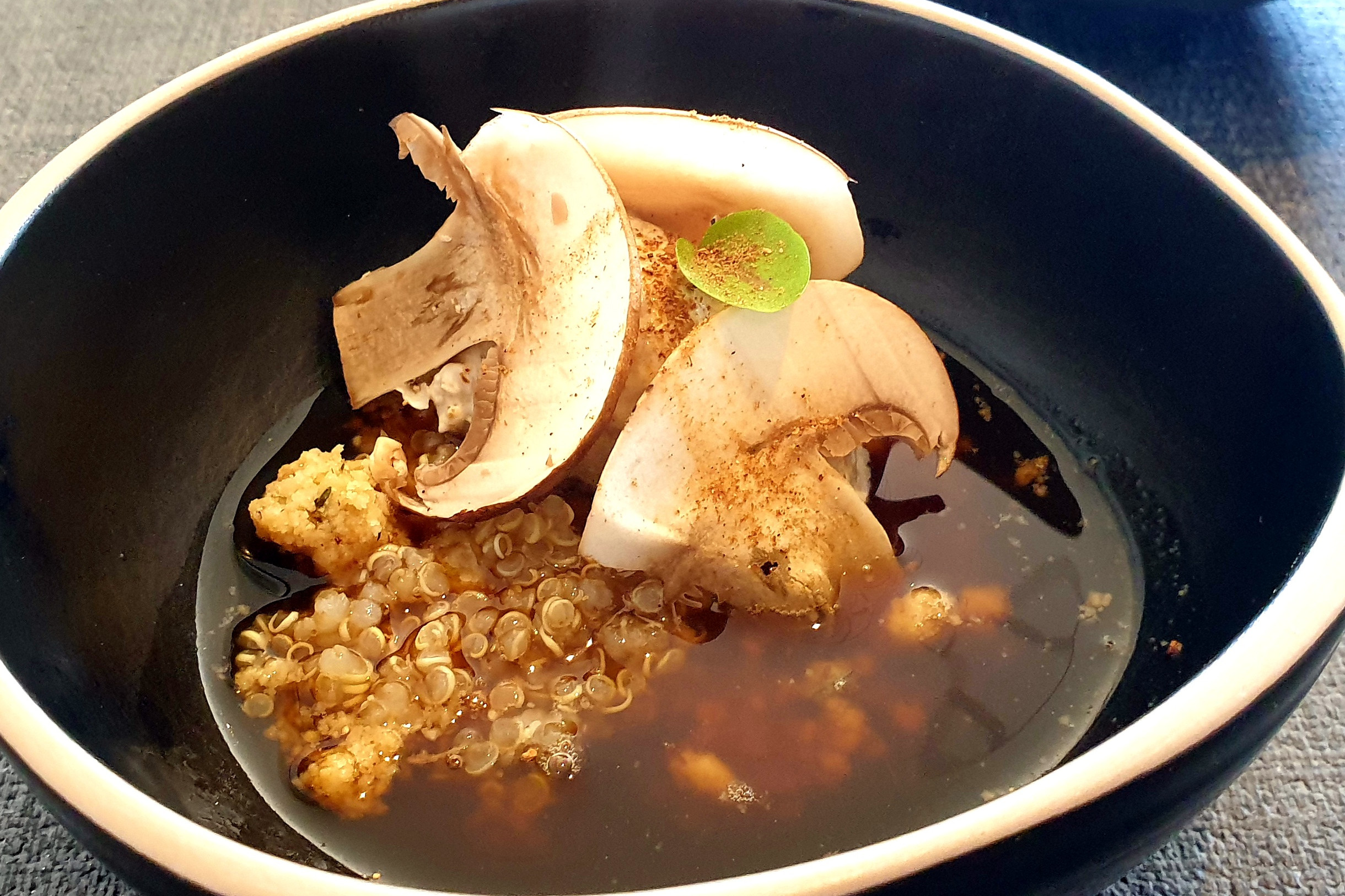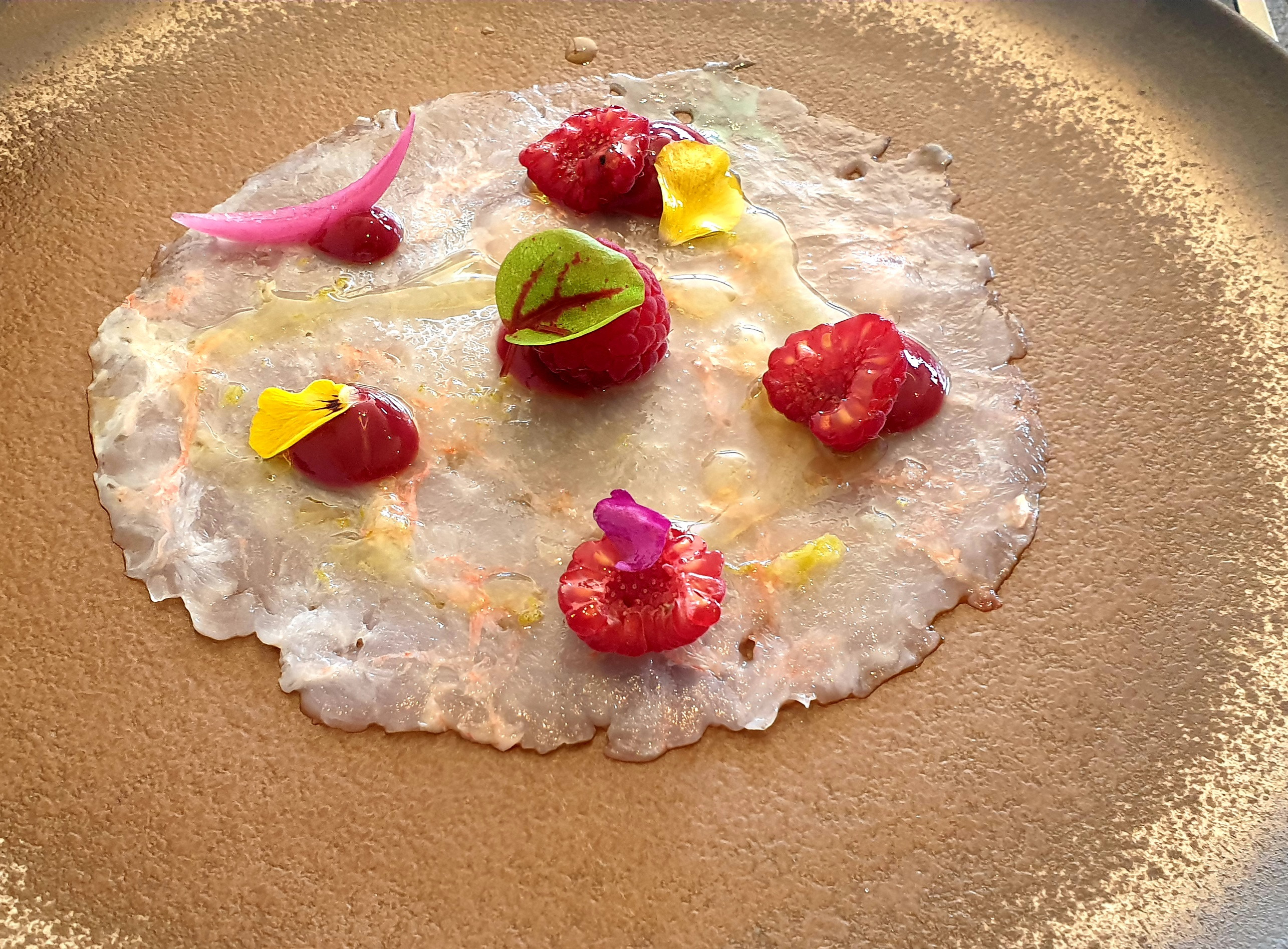 Der Auftakt begann mit Champagner und einer Sichuan-Pfefferblume als ersten Gruß aus der Küche. Danach kam eine überbackene Auster mit Kaviar – ein wahrer Gaumenschmaus. Es folgte Tomatenschaum mit Basilikum-Sorbet und Heilbutt, der einfach perfekt abgestimmt war.