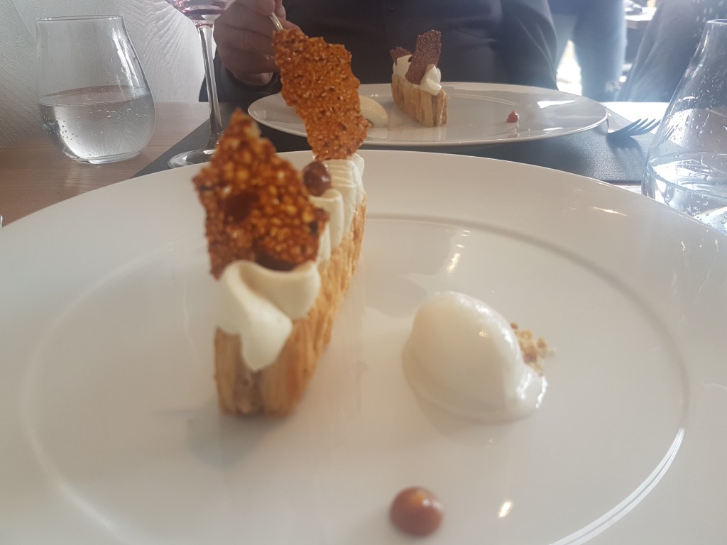 Das Dessert? Seine eigene Interpretation eines Käsekuchens, gefolgt von Café Noire, gereiftem Calvados und hausgemachten Pralinen.