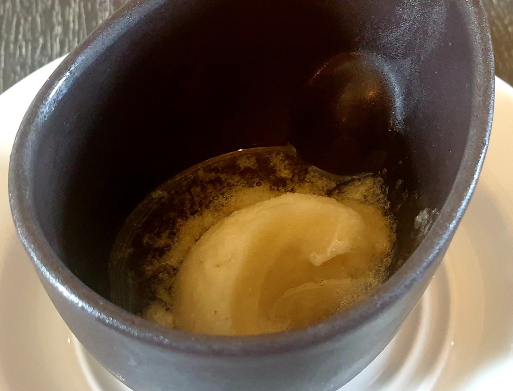 Ein weiterer Gang lieferte eine Schale mit 10-15 verschiedenen Gemüsesorten, passend zur Jahreszeit und mit reichlich Spargel. Auf die kalten Gänge folgte heißes Chawanmushi, garniert mit Kaviar, bevor der Fischgang mit grünem Spargel und einer intensiven Sauce auf den Tisch kam. Das für die Normandie typische Apfelsorbet rundete das Ganze ab. Bevor die Taube serviert wurde, gönnten wir uns noch eine Scheibe Wagyu Beef und eine ganze Trüffel – ein eher luxuriöses Vergnügen!