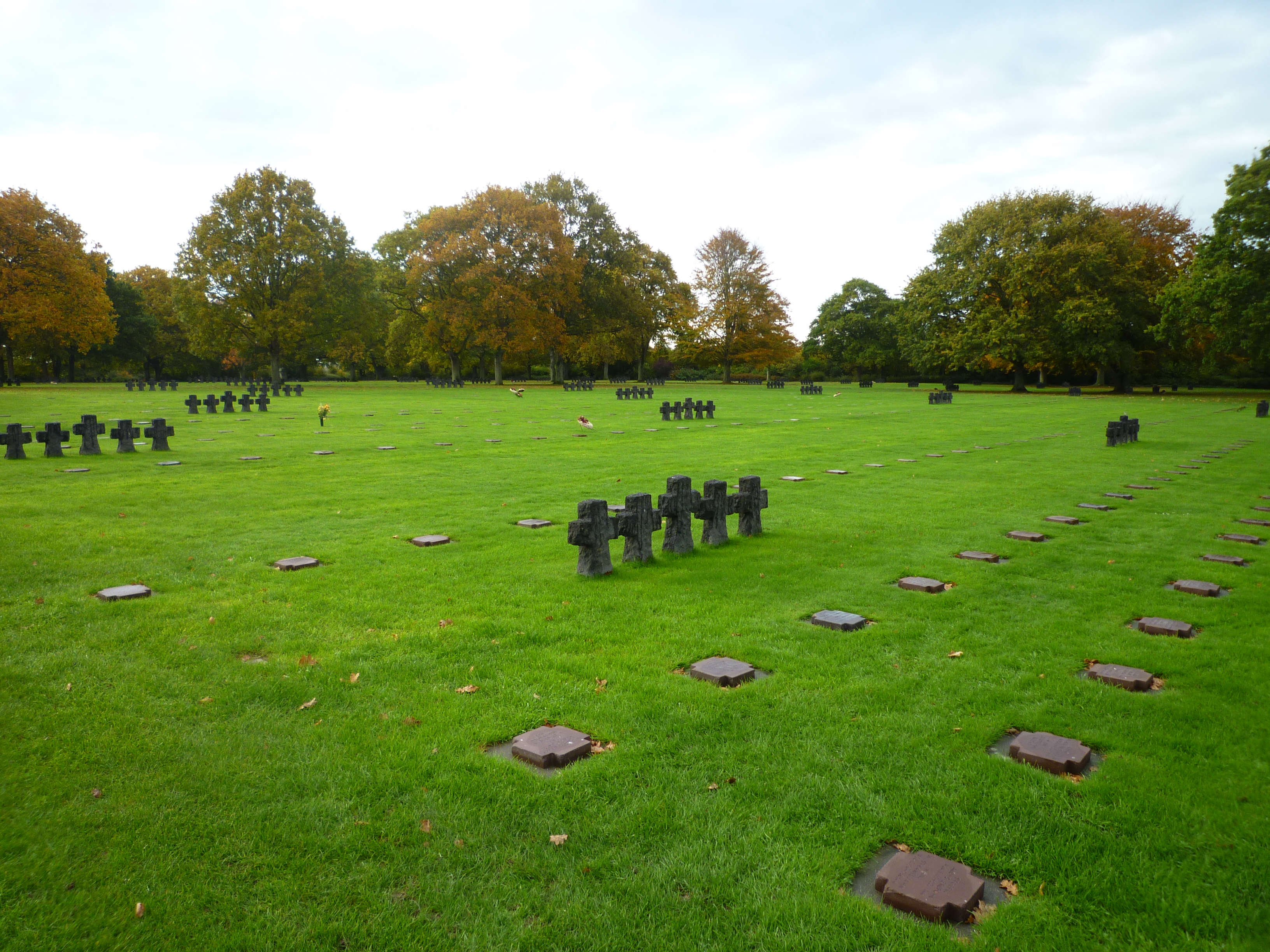 Dieser ca. 7 ha große Friedhof wurde 1961 fertiggestellt und eingeweiht. Vom Dorf la Cambe kommend durchfährt man den Friedenspark und gelangt zum Parkplatz und dem Besucherzentrum. Dieses wurde in den 1990iger Jahren gebaut und liegt zwischen Friedhof und Autobahn. Am Eingang des Friedhofs ist eine Gedenkkapelle errichtet. Den Friedhof selbst erreicht man durch eine recht schmale Tür. Von hier gehen zwei Gedenkräume ab. Der Friedhof ist als rechteckige Rasenfläche angelegt. In der Mitte ein Tumulus mit einem gewaltigen Basaltlavakreuz. Von hier aus hat man einen guten Überblick über das beeindruckende Gräberfeld mit seinen gruppenweise angeordneten Kreuzen und Grabplatten. Insgesamt wurden 21.222 deutsche Soldaten auf dem Soldatenfriedhof von La Cambe beerdigt. 207 unbekannte und 89 identifizierte Soldaten wurden in Massengräbern bestattet. Geht man durch die Grabfelder sieht man den Wahnsinn des Krieges auch an Jahreszahlen. Viele der gefallenen Soldaten waren gerade mal 20 Jahre alt. Geboren 1923 – 1924 oder 1925, gefallen Juni – Juli – August 1944.