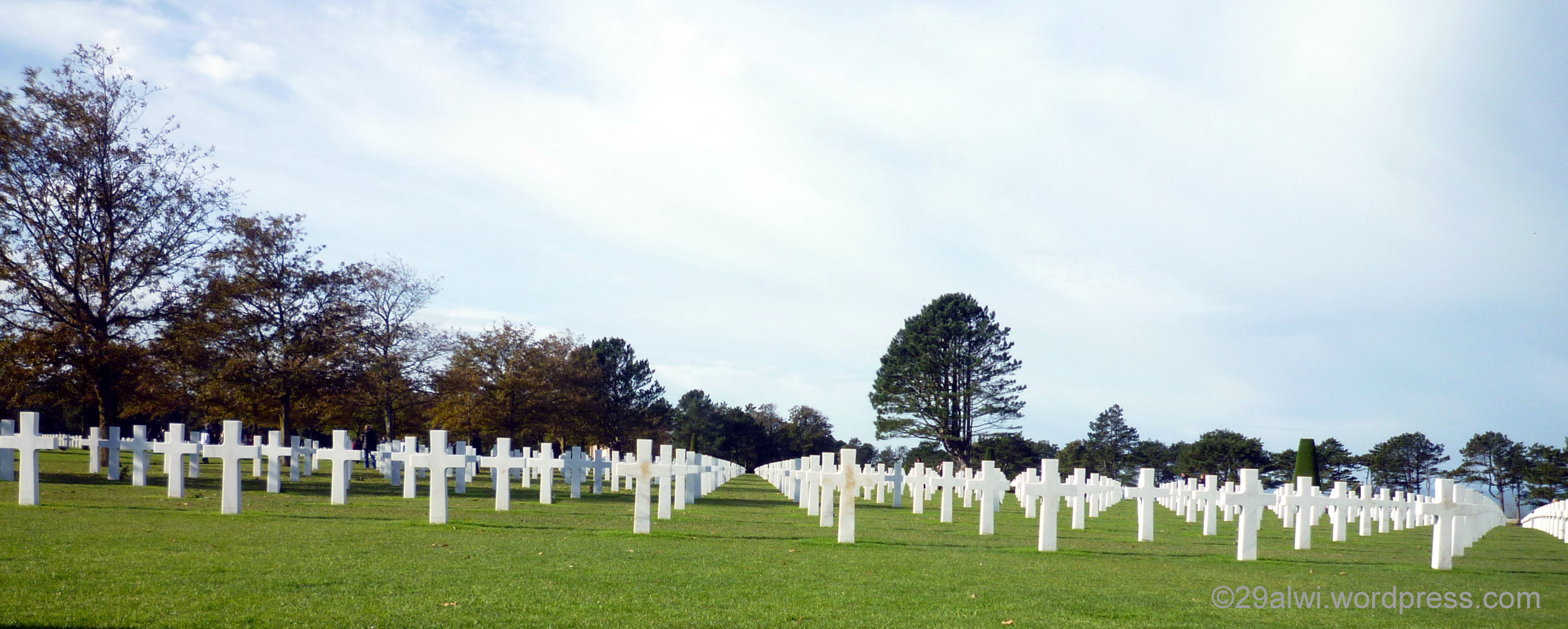 Der 1956 vom französischen Staatspräsidenten Coty und dem amerikanischen General Marshall eingeweihte Normandy American Cementery liegt inmitten eines 70 Hektar großen Terrains, das von Frankreich an die Vereinigten Staaten abgetreten wurde. 9 386 perfekt aneinander gereihte Grabsteine und der „Garten der Vermissten“ mit den eingravierten Namen von 1557 Soldaten überragen den Strand Omaha Beach.