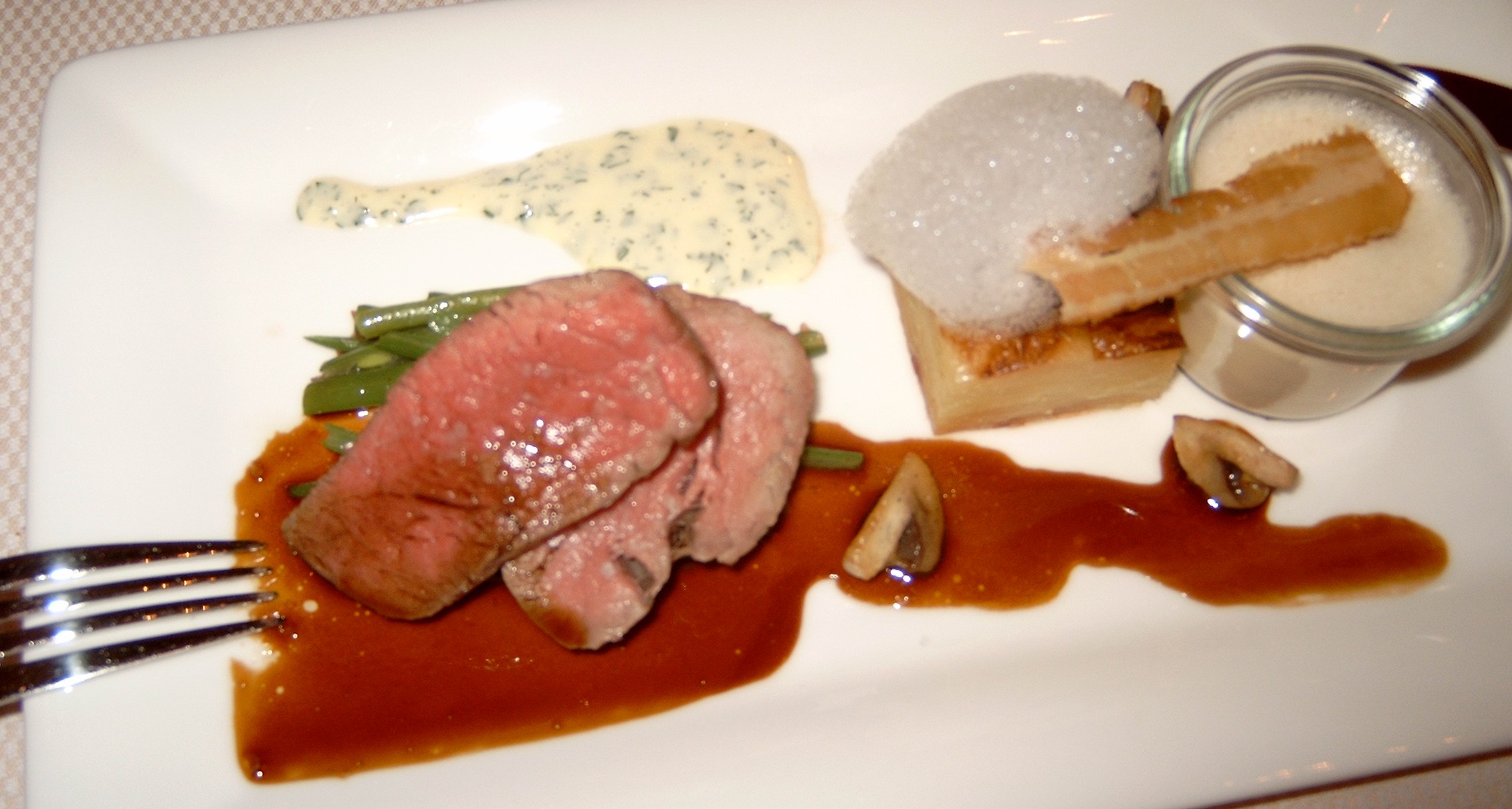 Cremiges Süppchen mit gutem Linsengeschmack, die zarte Wachtelbrust kam gegen den doch kräftigen Linsengeschmack nicht an. Eigentlich ist die Brust nicht notwendig.