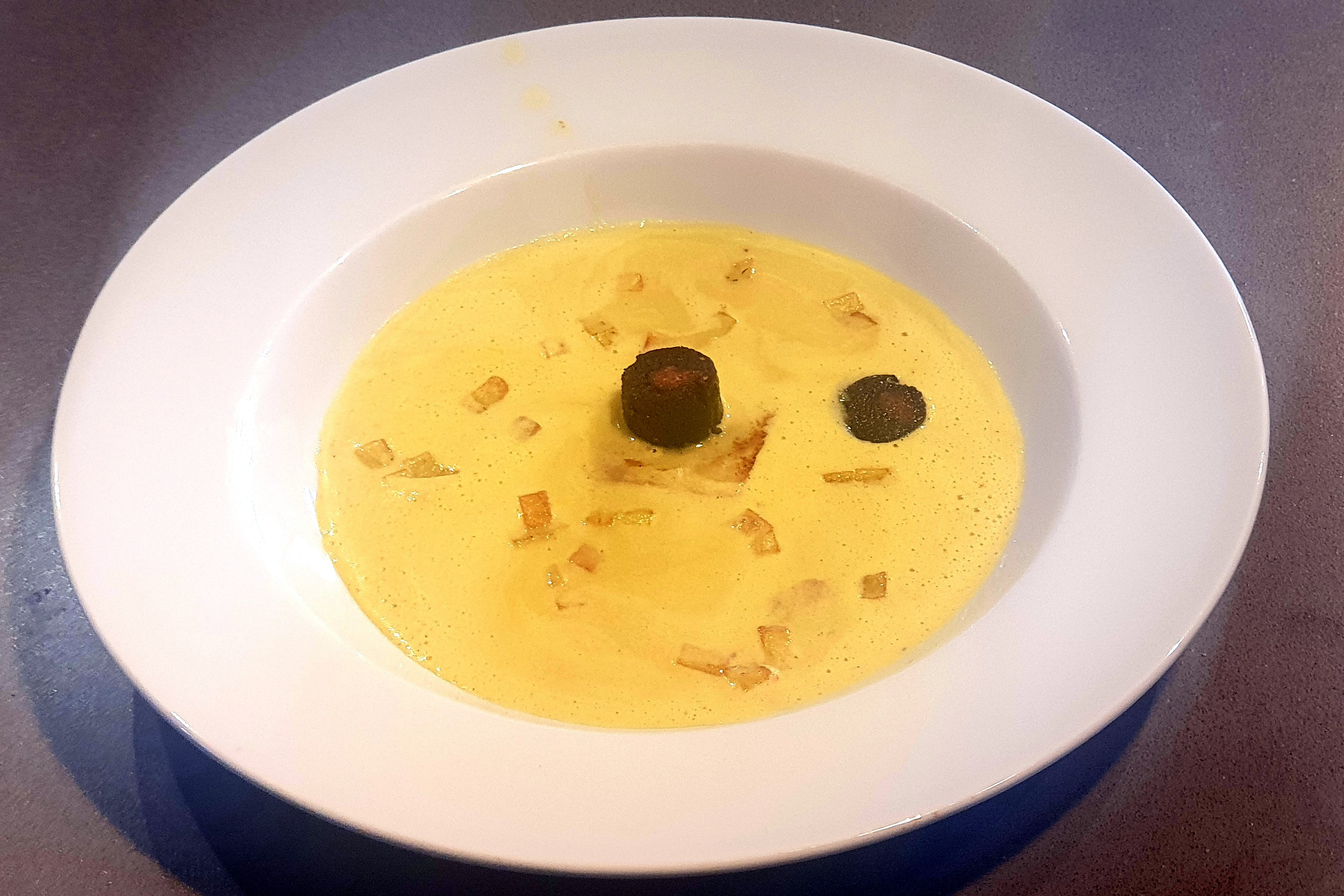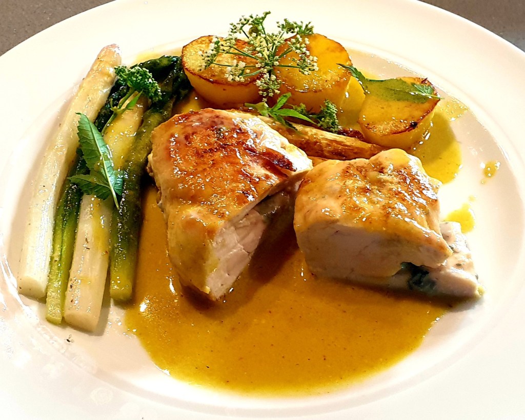 Da man ja leider zurzeit nicht mehr auswärts essen gehen kann, muss man halt zu Hause kreativ werden. Zum Auftakt Bruschetta. Fenchelcremsuppe Die Zwiebel sehr fein würfeln. Die Fenchelknolle putzen, beschädigte Außenblätter entfernen, die Knolle senkrecht halbieren. Von einer Hälfte senkrecht mit dem Gemüsehobel feine Scheibchen abhobeln und beiseitelegen. Den Fenchel klein würfeln. Fenchel in Olivenöl in einer Kasserolle andünsten. Auch klein gewürfelte Kartoffel zufügen und mit dünsten. Mit Noilly Prat und Pastis ablöschen. Mit Brühe (oder Wasser) auffüllen, salzen, pfeffern und zugedeckt 30 Minuten alles vollkommen weich dünsten. Danach Sahne zufügen, einkochen lassen und alles mit dem Pürierstab glatt mixen. Wer will kann die Masse durch ein Sieb streichen. Abschmecken und evtl. nachwürzen. Ich habe etwas Piment d’Espelette und einen Spritzer Zitronensaft hinzugefügt Die Suppe vor dem Servieren nochmals aufschäumen, in tiefe Teller oder Suppentassen verteilen. Maispoularde Eingekauft in der Markthalle zu Kassel mit Haut und Knochen. Zu Hause wurden die Knochen ausgelöst und mit Wurzelgemüse, Weißwein und Wasser ein Fond hergestellt. Von der Brust wurde das Filet ausgelöst und als Beilage für die Fenchelsuppe verwendet. Die Brust wurde mit Olivenöl, Salz, Pfeffer, Curry und einer Prise Piment d’Espelette mariniert. Zuerst auf der Hautseite angebraten und anschließend auf der Fleischseite und danach für ca. 10 Min. im Ofen fertig gestellt. Die Karotten kamen für 7 Min. in den Dampfgarer und wurden dann karamellisiert. Aus Weißwein, Sahne und Hühnerfond sowie Gewürzen wurde eine schmackhafte Sauce hergestellt. Dazu ein klassisches Kartoffelgratin.Als Dessert ein Törtchen von Mousse au Chocolat. Eingekauft bei der http://www.pralinenwerkstatt.de/ von Thomes Ernst.