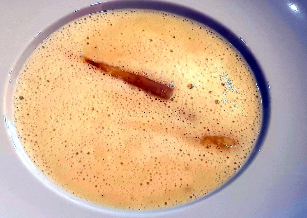 Als Aperitif gibt es einen selbsaufgestzten Orangenwein.Amuse Bouche: Lammfrikadelle, Resteverwertung Spitzkohlroulade mit Lammhack, TomatensauceSpargelcremsuppe mit WildkräuterölScheiben vom Kotelett, Bratkartoffeln, BrokkoliDessert: Suppe von weißer Schokolade mit Früchten (nach einer Idee von Marc Fosh, Mallorca)