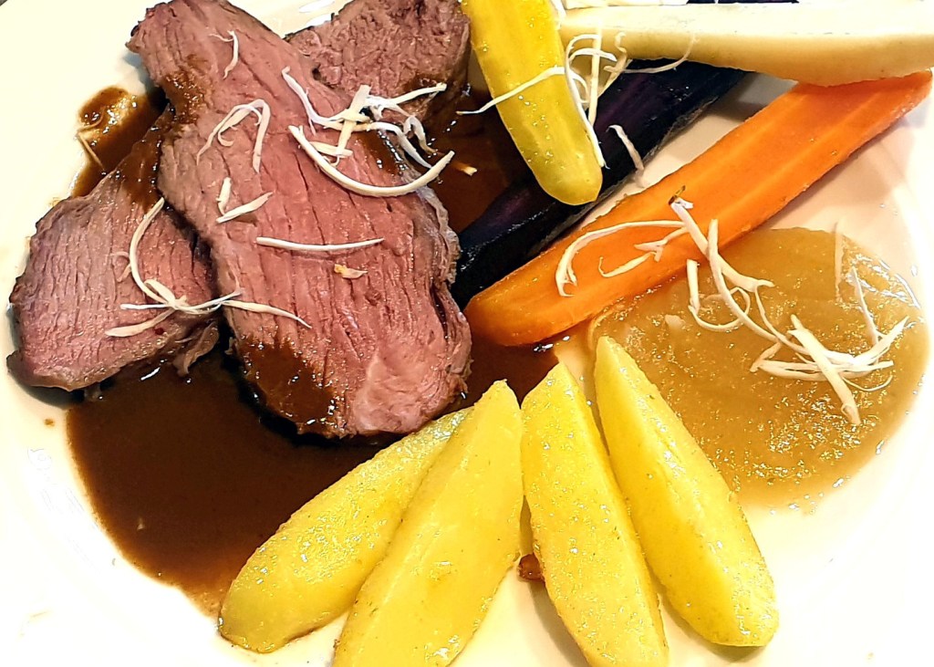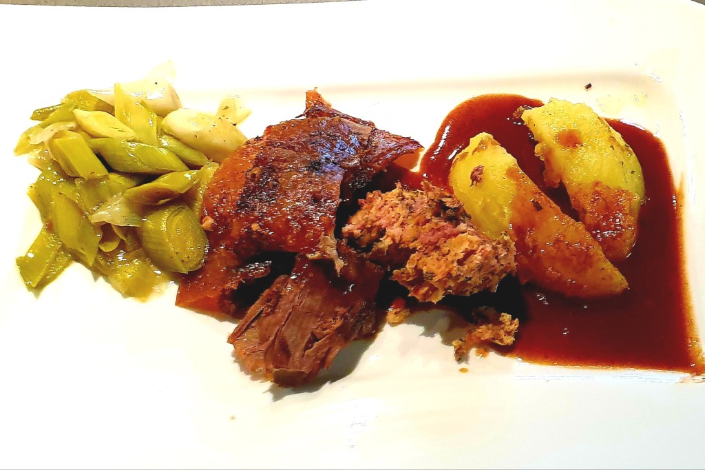 Mit Salzkartoffeln, Porree Gemüse und einer Sauce bestehend aus Gänsefond und Rotwein servieren. Käse