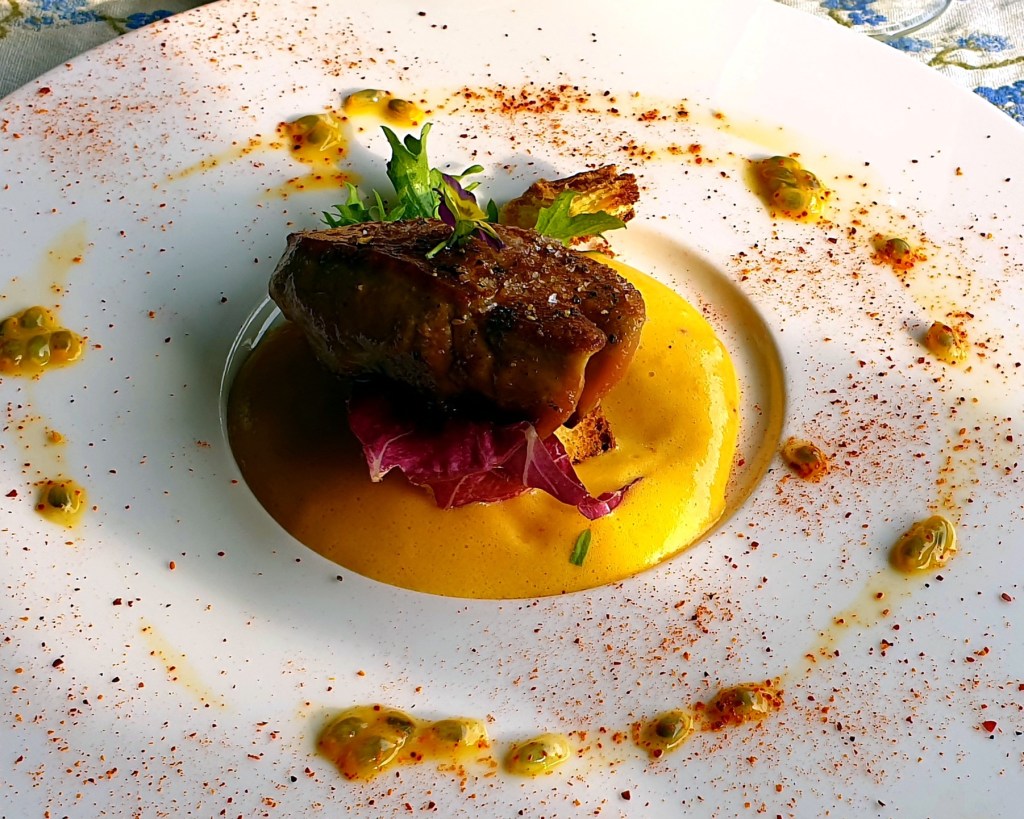 Ein kleines Stückchen Frankreich im Herzen des thüringischen Eichsfelds. In dem kleinen Örtchen Dieterode mit gerade mal 70 Bewohnern, hat Dr. Werner Freund, der aus Dieterode stammt, hat hier sein kleines Refugium erschaffen, zum Glück auch für seine Gäste. Das Fachwerkhaus aus dem 17. Jahrhundert, ist von außen bei weitem nicht perfekt restauriert, könnte aber in jeder französischen Provinz stehen. Auf der anderen Straßenseite eine kleine Auberge mit 7 Zimmern in ähnlichem Stil. Geöffnet ist das Haus von Mitte April bis Mitte Dezember. Aber nur am Wochenende und zwar Freitag und Samstag von 17.00 bis 23.00 Uhr und Sonntag von 12.00 bis 14.00 und von 17.00 bis 23.00 Uhr.Mit dem Blick in den herrlichen Naturgarten wird von Silke Urbach erstmal eine gut gekühlte Flasche Weißwein geöffnet. Der Riesling vom Weingut Born (Saale-Unstrut) löscht auf angenehme Art den ersten Durst.Nach einer kurzen Erholungspause in der Auberge ging es wieder in Richtung Restaurant. Im Eingangsbereich sitzt der Maître des Gartens mit Hut und einem Glas Wein in der Hand und begrüßt die Gäste. Er achtet aber auf die beiden Herde in denen die später teilweise die leckeren Speisen zubereitet werden. Vorbei an der Küche, hier steht bereits Küchenchef Daniel Müller, geht es auf die Galerie. Von hier aus haben wir einen herrlichen Blick in den Garten. Während Silke Urbach die Getränkewünsche bespricht, kommt Dr. Werner Freund an den Tisch und zählt das Angebot des Abends auf. Wir entscheiden uns für ein sechs Gang Menü. Eins muss man wissen, da es weder eine Wein- noch Speisekarte gibt, weiß man erst am Ende, was der Abend gekostet hat. Mit Getränken muss man zwischen 100 und 150 € pro Person rechnen.Leber mit Passionsfrucht.Flammkuchen mit Birnen und Stilton-Käse. Gehört zum Standardprogramm. Dünner knuspriger Teig. Baskische Fischsuppe. Gewürzt mit Pastis und Piment d‘Espelette. Hier ein kleiner Kritikpunkt. Der Fischanteil hätte etwas größer sein können.Gratinierter Ziegenkäse mit Wildkräutern und Honig.Lamm mit Bohnen, Tomaten und Kartoffelkuchen.Karamellisierter Aprikosenkuchen aus dem OfenBlick von der Terrasse in den Garten.