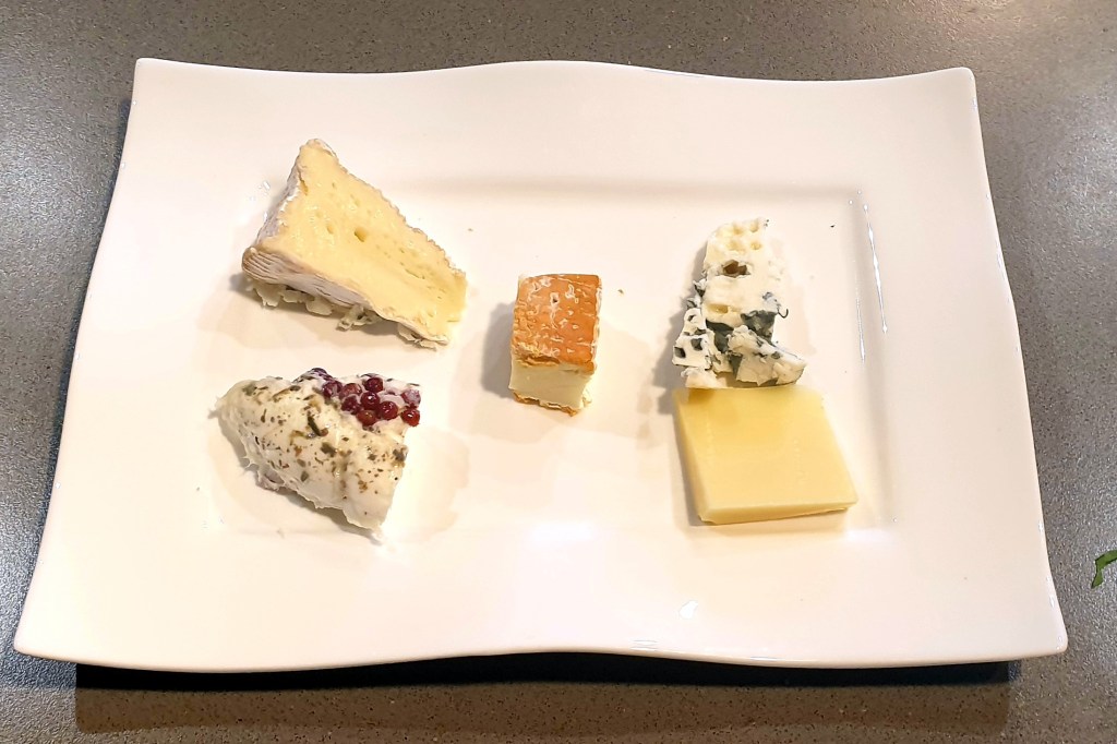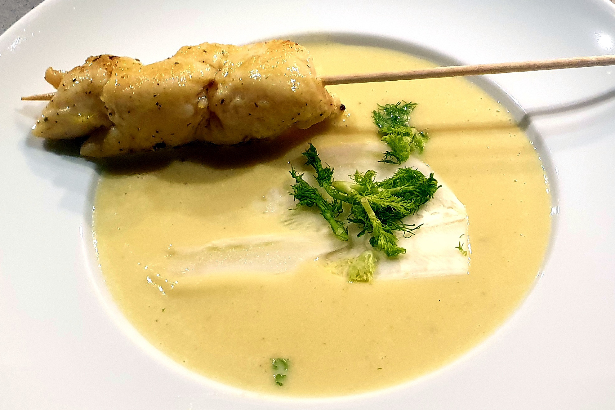 Giersch, Radieschen, geröstete Brotwürfel , ParmesanspäneCappuccino von der GarneleGarnelen, Rosmarin, Weisswein, Noilly Prat, Pastis.Kabeljau gebbraten, Sauce von Stangensellerie, Spitzpaprika, Pasta di Semola4 x Käse