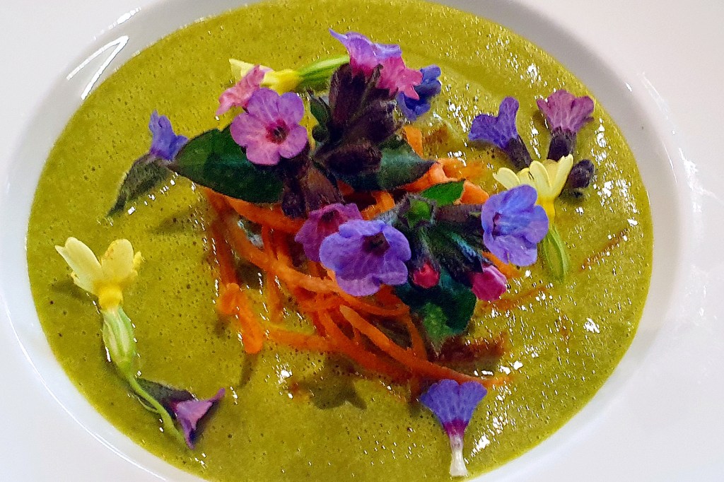 In Butterschmalz die kleingeschnittenen Gemüsezwiebeln sowie das Wurzelgemüse anschwitzen, die geschälten und gewürfelten Kartoffeln dazu geben, salzen und pfeffern. Etwas Gemüsebrühe dazugeben und ein reduzieren. Karottengrün einschließlich Stängel sehr fein schneiden, je feiner umso besser. Dann die Brühe so lange kochen bis die Kartoffeln weich sind. Anschließend portionsweise im Hochleistungsmixer pürieren und durch ein Sieb streichen. Wieder auf den Herd stellen und Sahne angewiesen. Anschließend nachwürzen. Ich habe in die Suppe noch etwas Zucker, Muskat und ein Hauch von Ras el Hanout nachgewürzt. Mit den Stabmixer anschließend mixen und in tiefe Teller geben. In die Suppe kommen noch geröstete Brotwürfel, frische Karottenstreifen und Blüten der Jahreszeit. Aus dem Garten kamen Blüten von der Schlüsselblume und Lungenkraut als Dekoration hinzu.