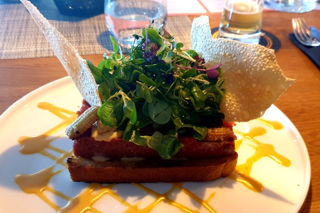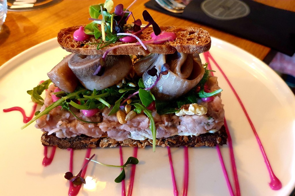 Danach ein „Kaffee Noir und ein Croissant bzw. ein Rührei mit Krabben zum Frühstück. Dann Erholung im Strandkorb und Spaziergänge am und im Wasser. Zum frühen Abend dann mit Hanne und Herbert mit dem Auto in Richtung Keitum in das Restaurant „Brot&Bier. Eine Reservierung war erforderlich, leider waren die Tische im Freien alle belegt. Wir haben uns aber auch im Inneren sehr wohlgefühlt. Die Abstände von Tisch zu Tisch waren optimal. Die Einrichtung ist sehr stylisch mit einer Mischung aus rustikal und schick. Von unserem Tisch konnten wir den Köchen hinter der Glastheke in der Showküche bei dem Anrichten der Speisen zusehen. Es entstehen kleine, schmackhafte kleine Kunstwerke. Vorab gab es „Watt zum Dippen“. Wohlschmeckendes Kristallbrot und Landbrot dazu verschiedene Cremes und Dips. Zum Trinken kein Wein, sondern frisches, kühles Bier von der Sylter Meersalzmanufaktur in List.Aus der kleinen Speisekarte habe ich mich für Rindertatar auf Focaccia mit Feldsalat, Chili-Cheese Mais und Linsen entschieden. Eine gute Wahl. Das Fleisch gut gewürzt, das kunstvoll drapierte Gemüse brachte Frische und zusätzliche Würzung an das Gericht. Eine etwas andere Brotzeit. Auch die anderen Brotstullen entsprachen unseren Erwartungen.Auf Friesenbrot gab es Matjes Tatar mit Sherry Matjes, Hausfrauensauce, rote Bete, Nuss Crunch und RucolaZiegenkäse geht immer. Focaccia mit gratiniertem Ziegenkäse, Rucola, Tomate Pinienkerne und French Dressing Kristallbrot mit Frikadellen, Kartoffel-Specksalat, Sylter Koggen Senf und Gewürzgurke. Hier eine kleine Kritik. Die Frikadellen wurden zu kalt serviert.