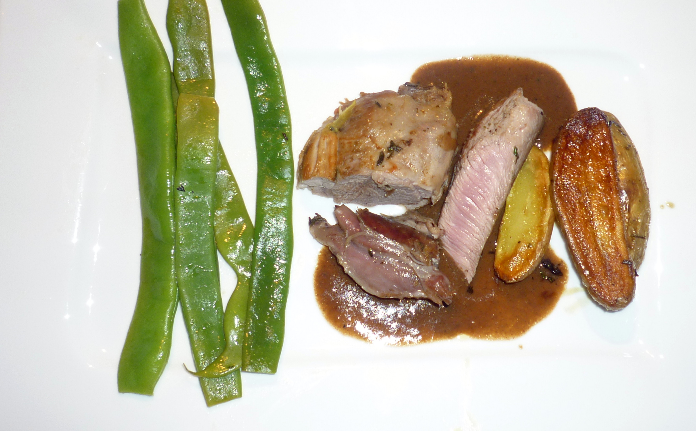 Die Kalbsbäckchen briet ich am Vortag an, fügte Wurzelgemüse und Tomatenmark hinzu, goss Rotwein auf und ließ alles mehrmals einkochen. Dann schob ich es für drei Stunden bei 125 Grad in den Ofen. Am nächsten Tag erwärmte ich die Bäckchen in der Sauce und servierte sie mit Kartoffelpüree und grünen Bohnen.
