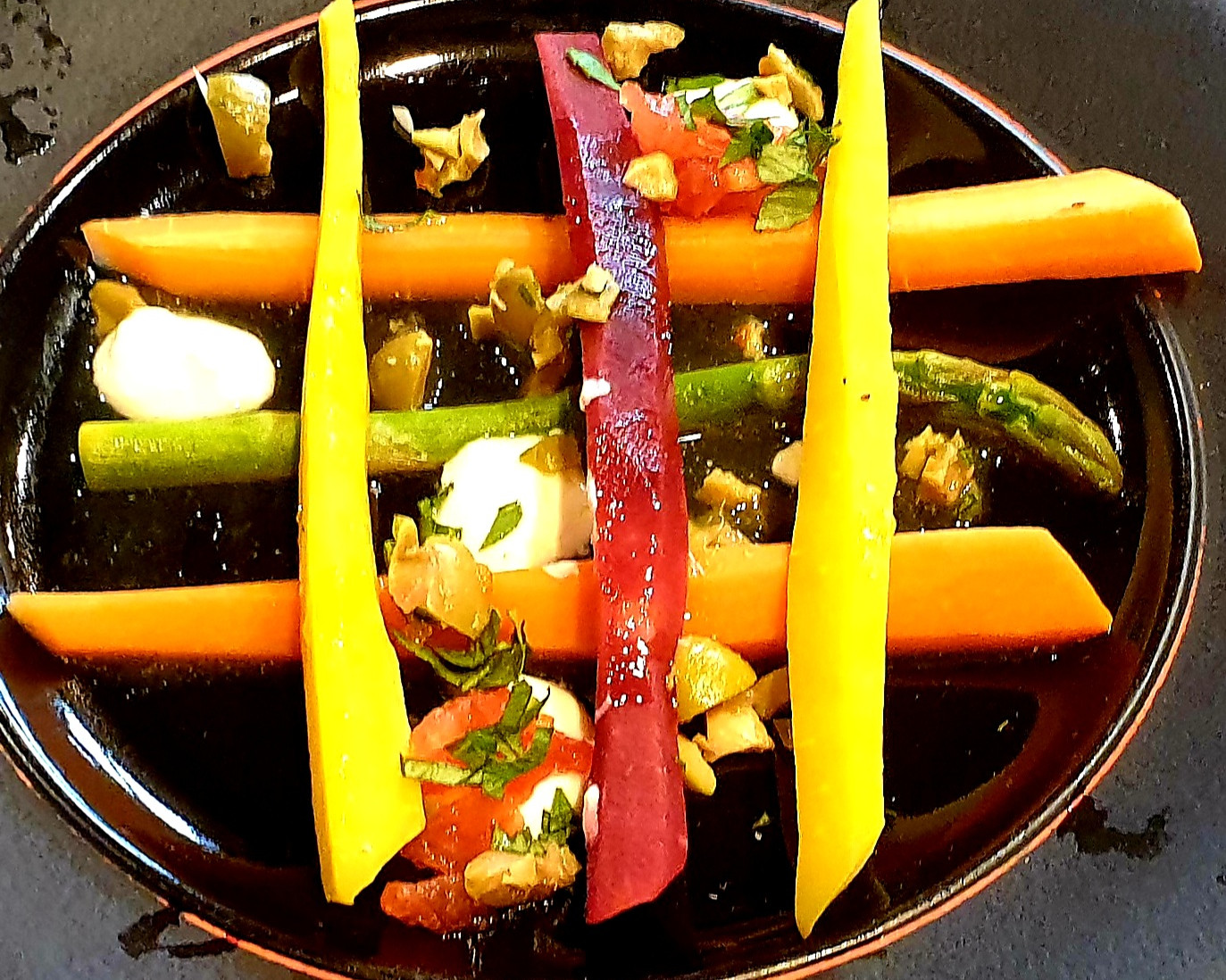 Panierter Spargel mit Giersch und Blüte von der Senfrauke