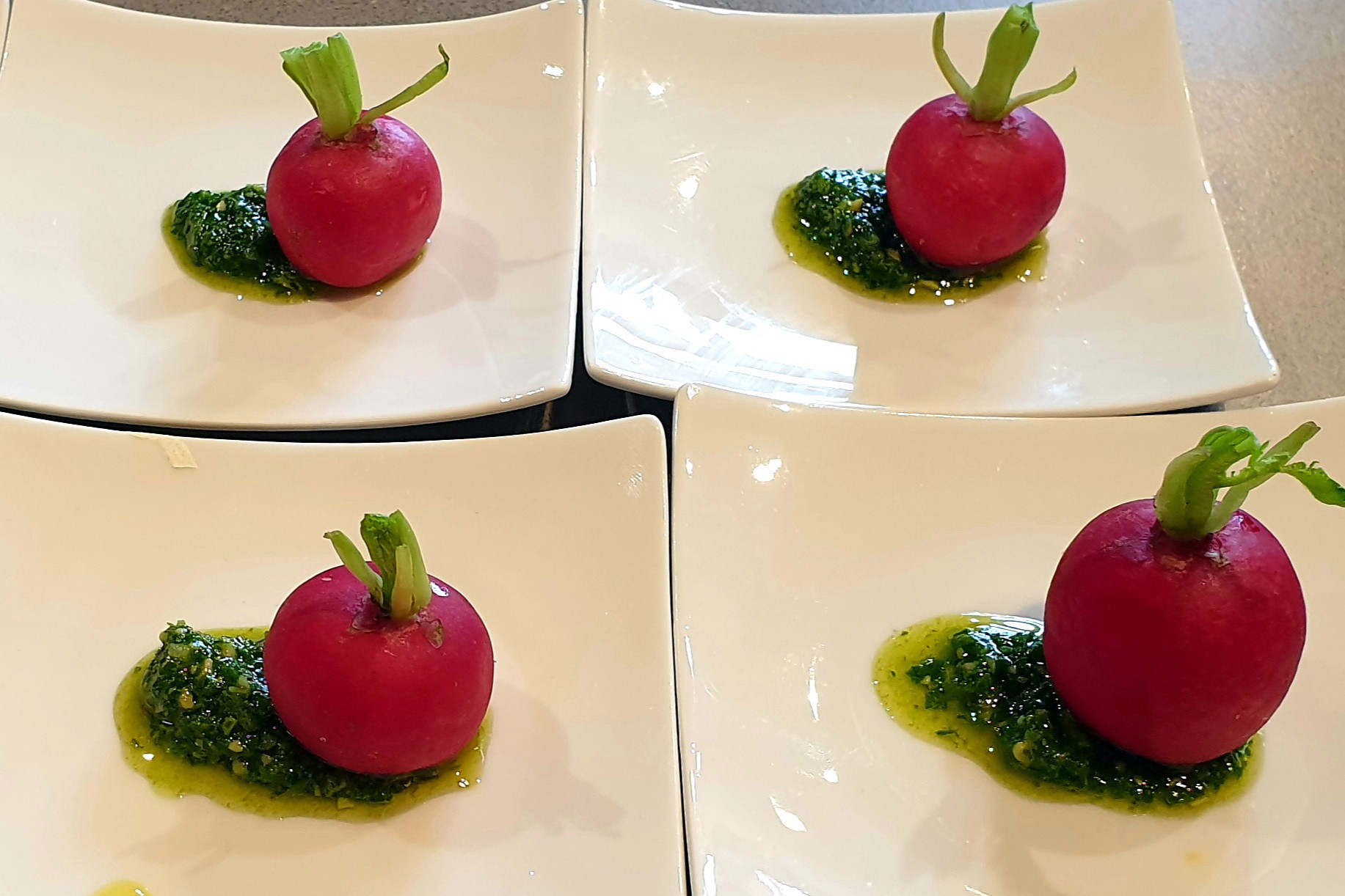 Alles Radieschen als Amuse Bouche, die Blätter zu einem Pesto verarbeitet.