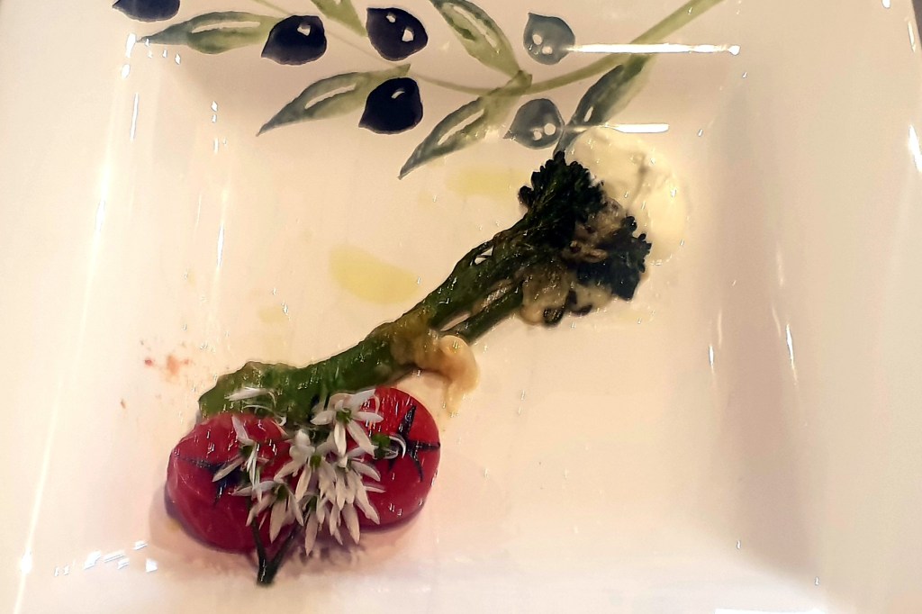 Überbackenen wilden Brokkoli mit Tomate und Bärlauchblüte