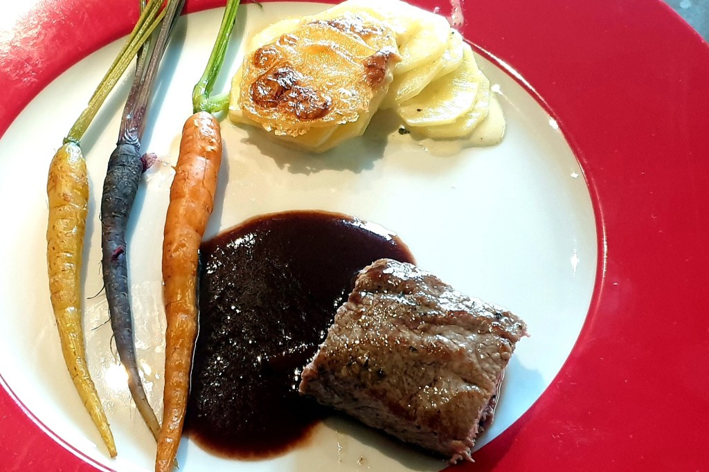 Lammrücken, Kartoffelgratin, bunte Möhren, Lammsauce mit viel Rosmarin