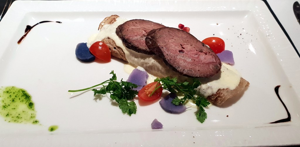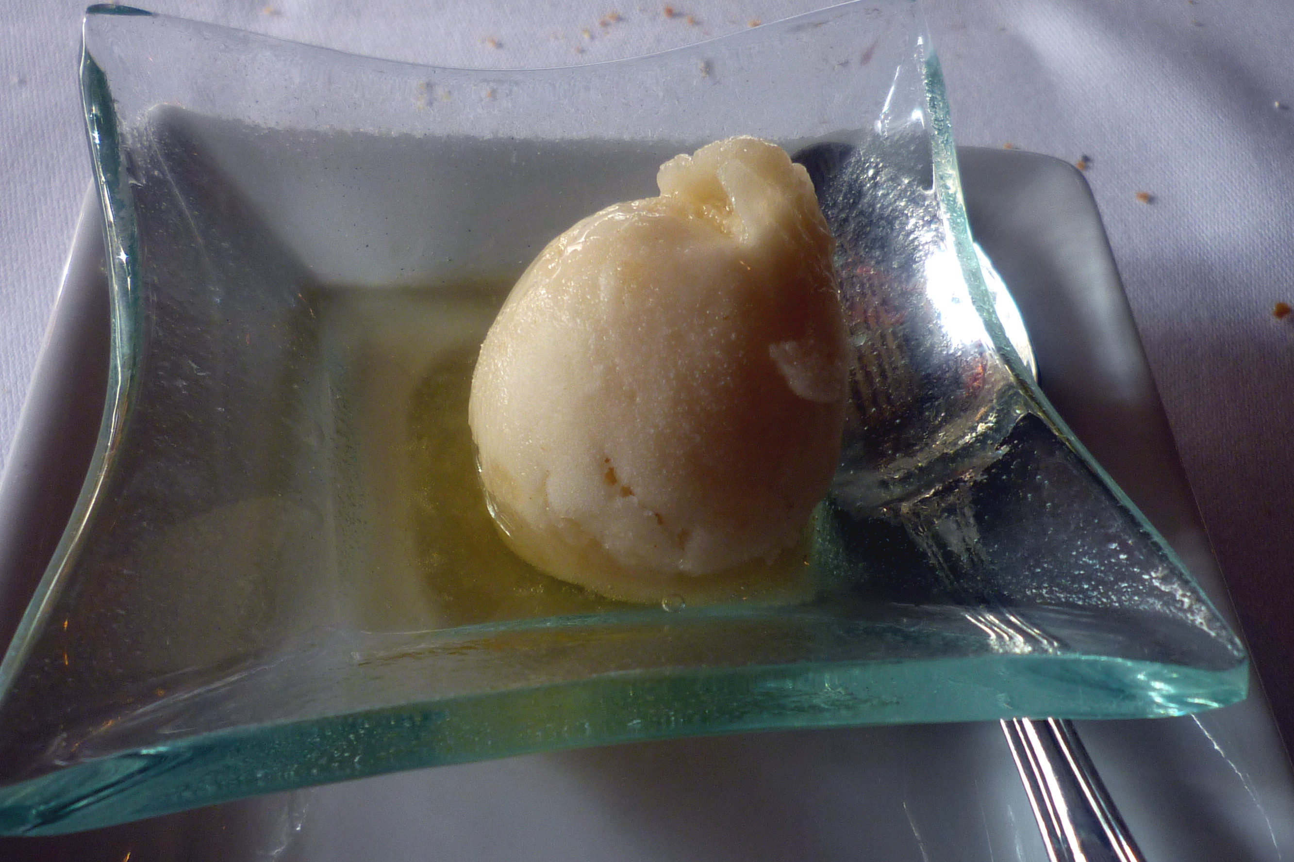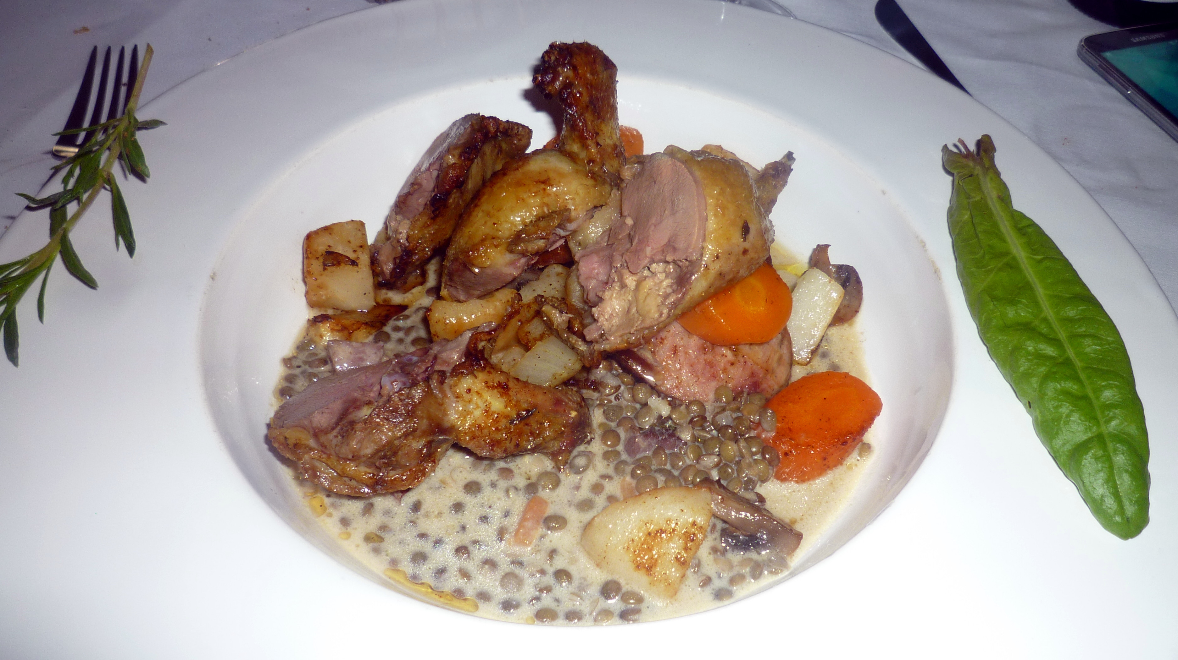 Ein Gang, bei dem Gaumen und Magen Schwerstarbeit zu leisten hatten. Die Taube nicht rosarot gebraten, sondern fast durch, aber sehr saftig und mit einem wunderbaren Taubengeschmack. Die Linsen brachten einen gewissen Biss und die Wurst einen leichten Rauchgeschmack an diesen sonst gelungenen Gang.