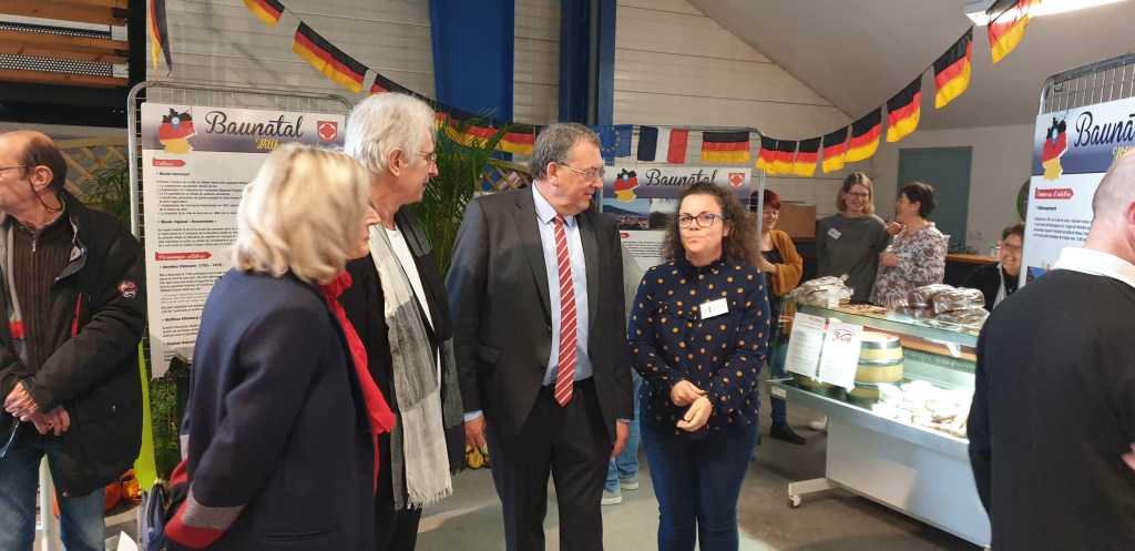 Wie gut, dass ich keine Funktionen habe, der Stand ist fertig aufgebaut und die Besichtigung beginnt. An der Spitze Monsieur Marc Andreu Sabater, Bürgermeister der Stadt Vire Normandie und für Baunatal meine Nachfolgerin Magalie Kiepe.