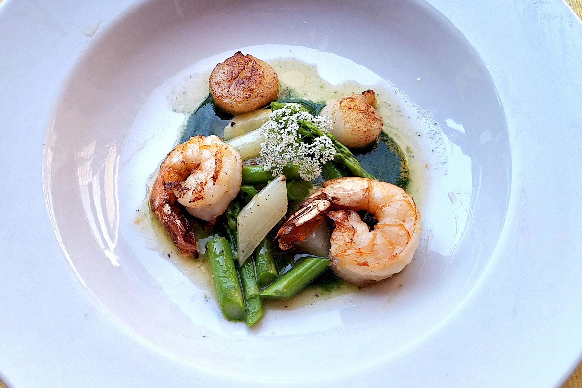 Kammmuscheln, Garnelen, grüner und weißer Spargel auf Spinatcreme. Gierschblüte.