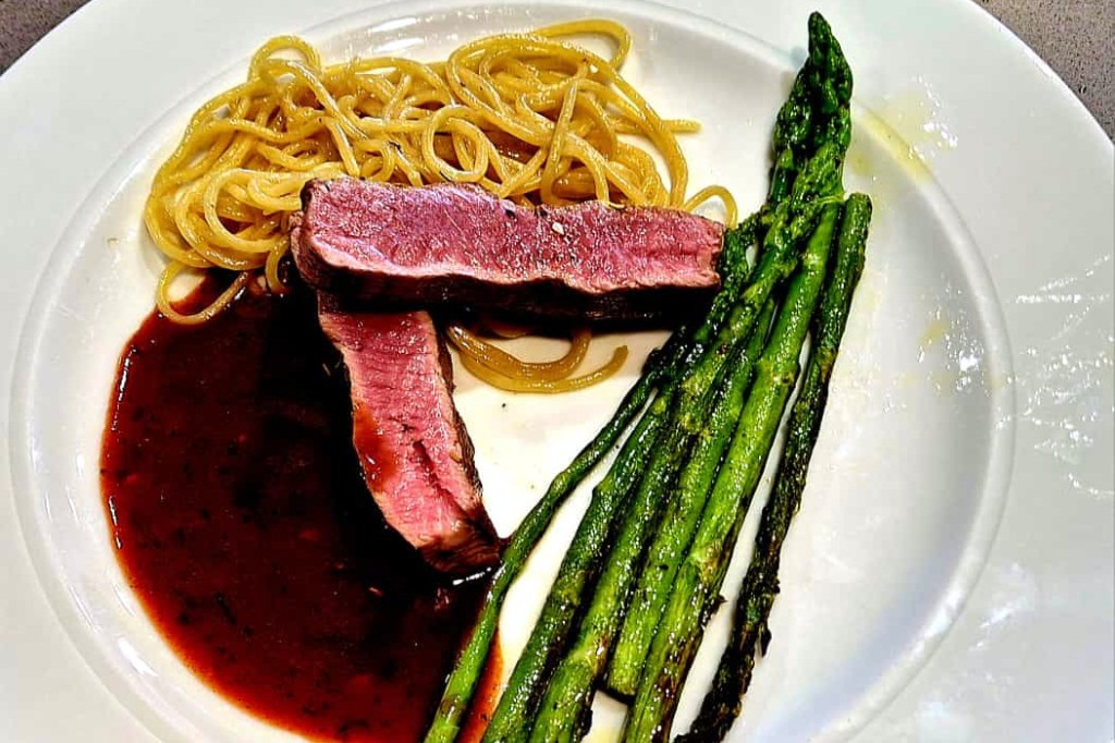 Lammrücken, grüner Spargel, Spagetti, Thymiansauce