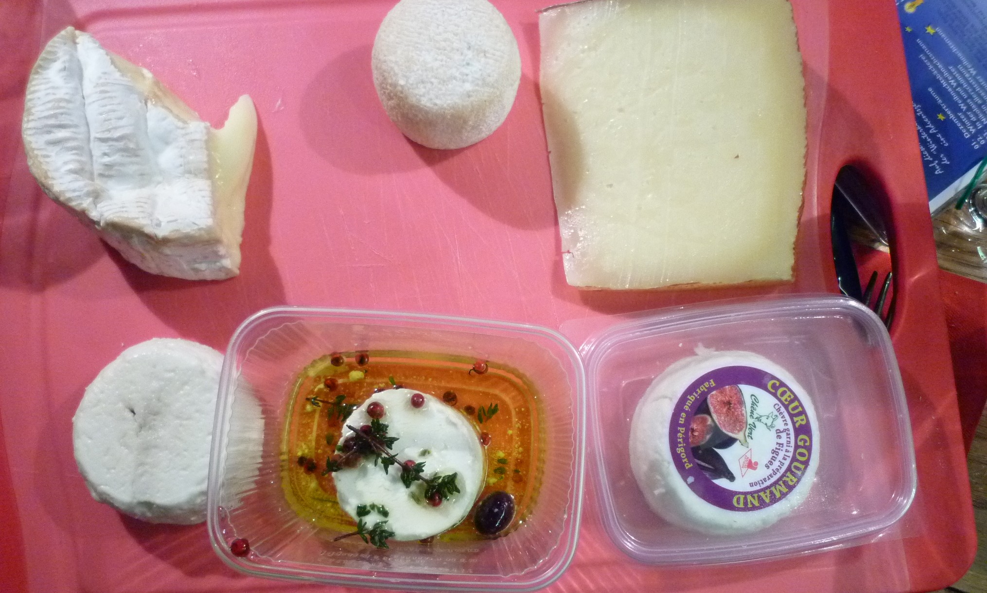 Aus den Markthallen vier verschiedene Sorten Ziegenkäse. Eingelegt in Öl, mit Feige, Crottin de Chavignol in zwei verschiedenen Reifegraden. Gut gereifter Camembert , sowie Manchego