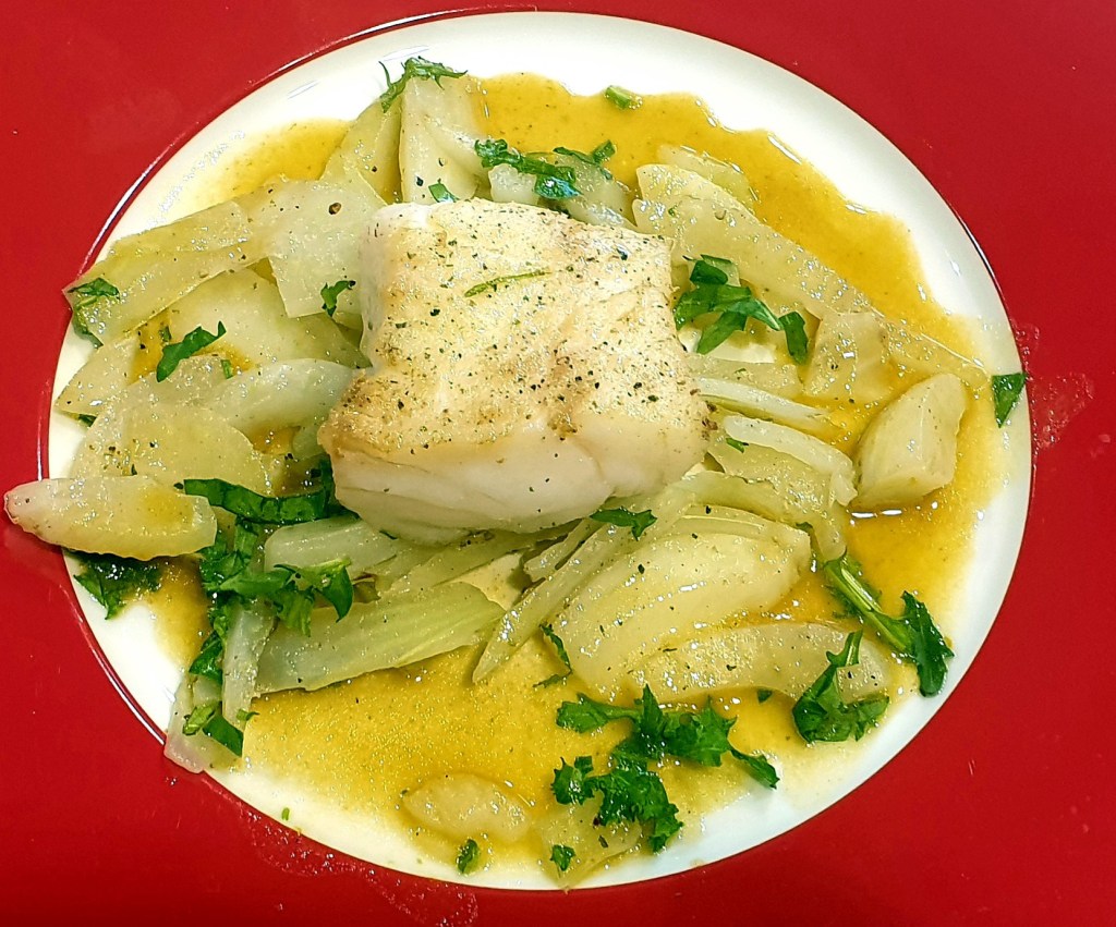 Steinbeißer gebraten auf gedünsteten Fenchel.