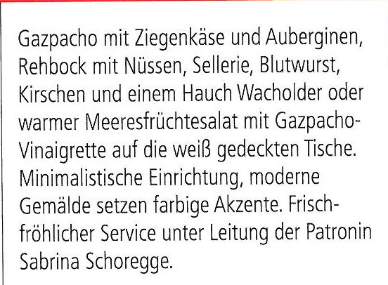 Fazit: Bekanntes wird behutsam erneuert. Nach ihren eigenen Aussagen verwendet sie regionale Zutaten soweit es irgendwie geht. Fleisch und Wild bezieht sie von einem Metzger aus dem Nachbarort, der noch selbst schlachtet. Käse kommt vom Kellerwaldhof, einem Biohof aus Bad Zwesten. Katja Hack schafft es, mit ihrer Küche, den weißen Fleck auf der kulinarischen Landkarte Nordhessens etwas kleiner werden zu lassen. Sie bringt frischen Wind in die nordhessische Gastroszene.